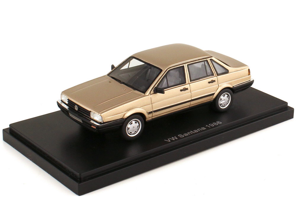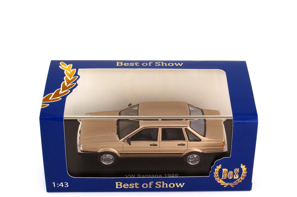 Best of Show-Modellauto, M 1:43, VW Passat Stufenheck (Typ B2, 1986) savannenbeige-met. (Sockeldruck und Typenbezeichnung am Heck: Santana)