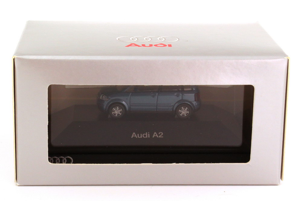 Rietze-Modellauto in Minivitrine, M 1:87, Audi A2 atlantikblau-met. (Audi-Werbemodell)