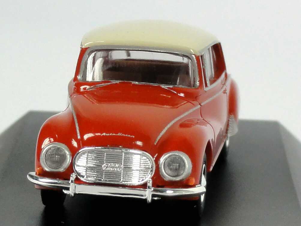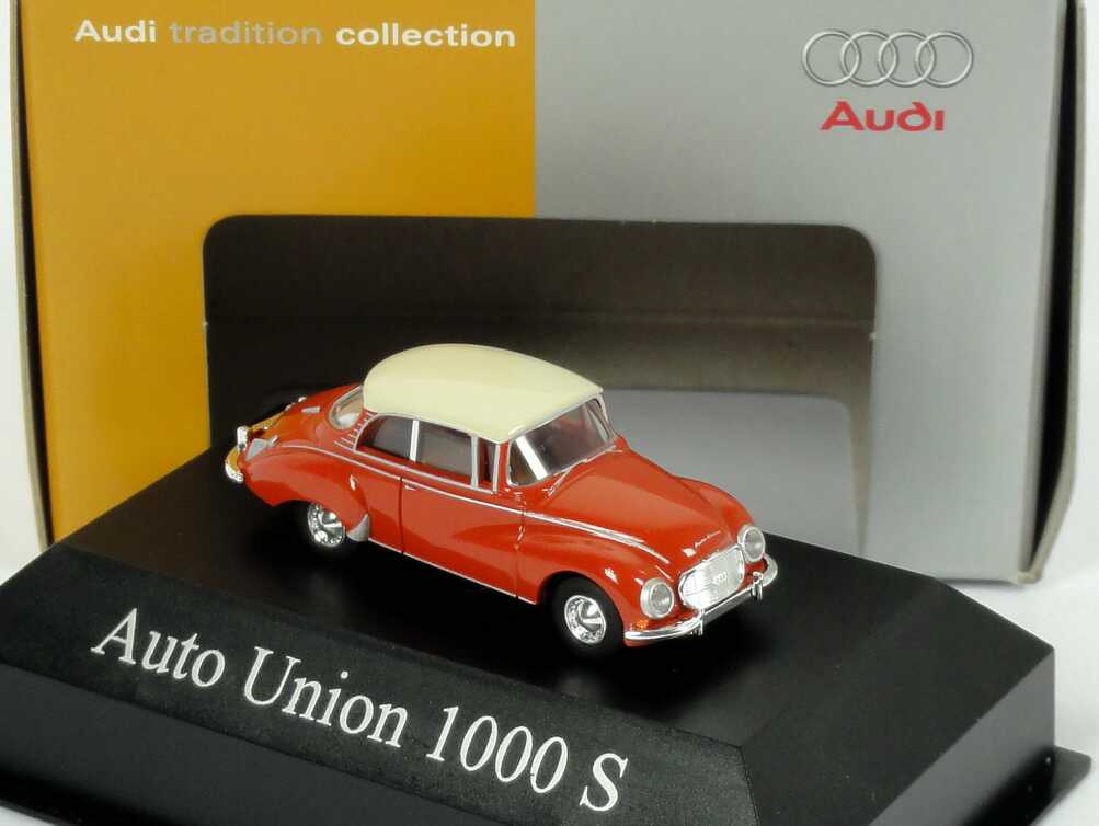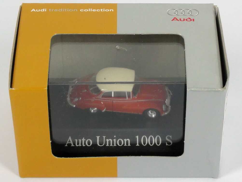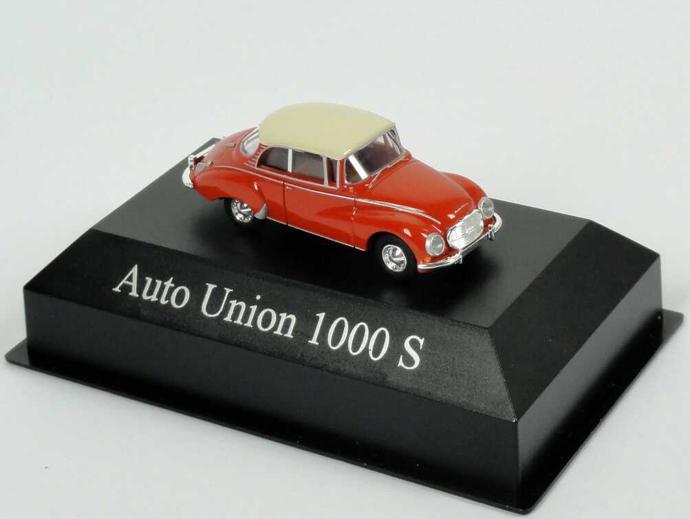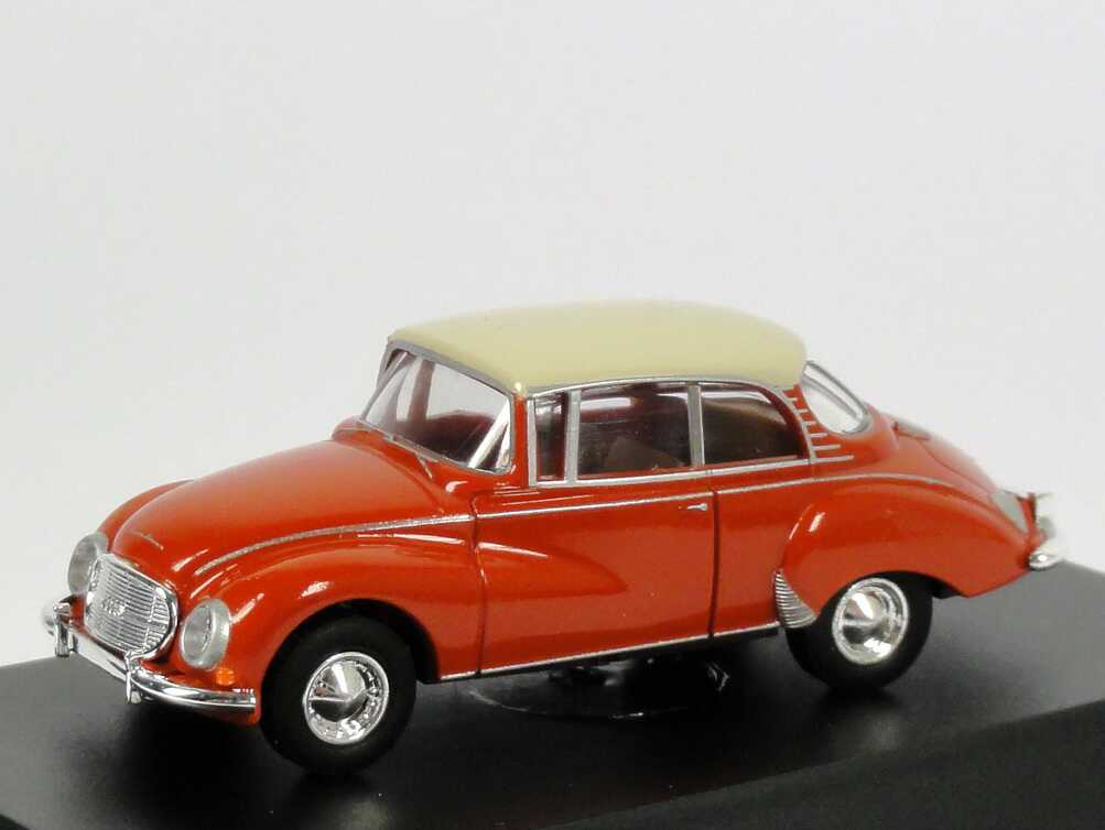 Brekina-Modellauto in Minivitrine, M 1:87, Auto-Union 1000 S Coupé rot/beige (Audi-Werbemodell)