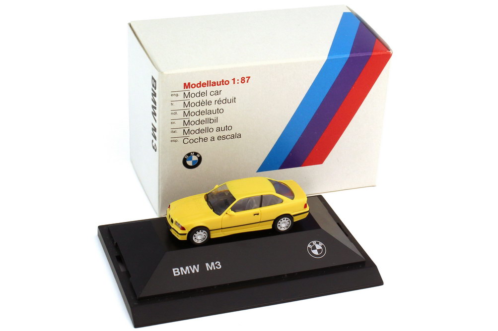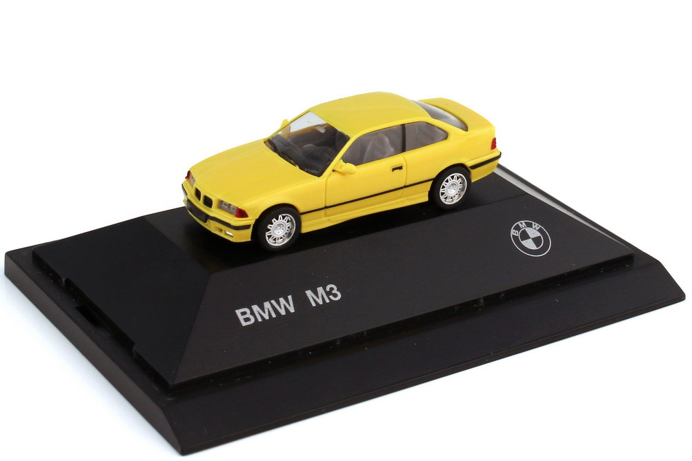 herpa-Modellauto in Minivitrine, M 1:87, BMW M3 Coupé (E36) dakargelb (BMW-Werbemodell)