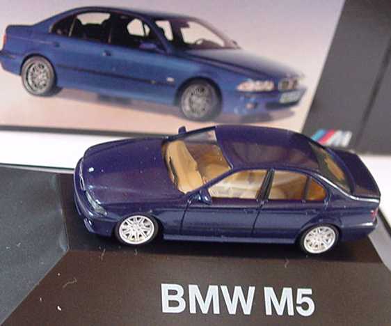 herpa-Modellauto in Minivitrine, M 1:87, BMW M5 (E39) le-mans-blaumet. (BMW-Werbemodell)