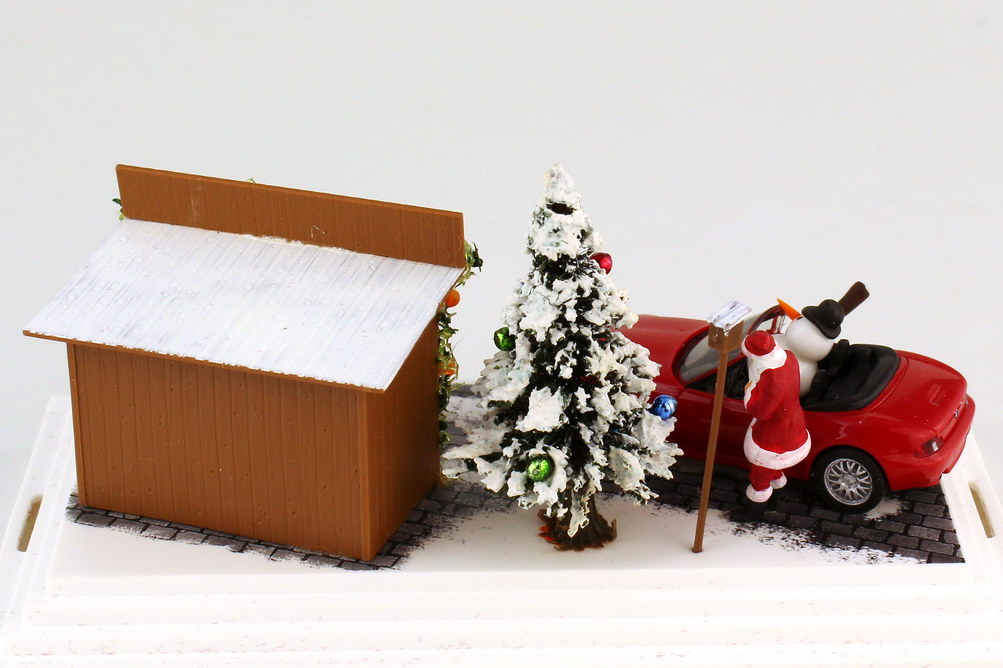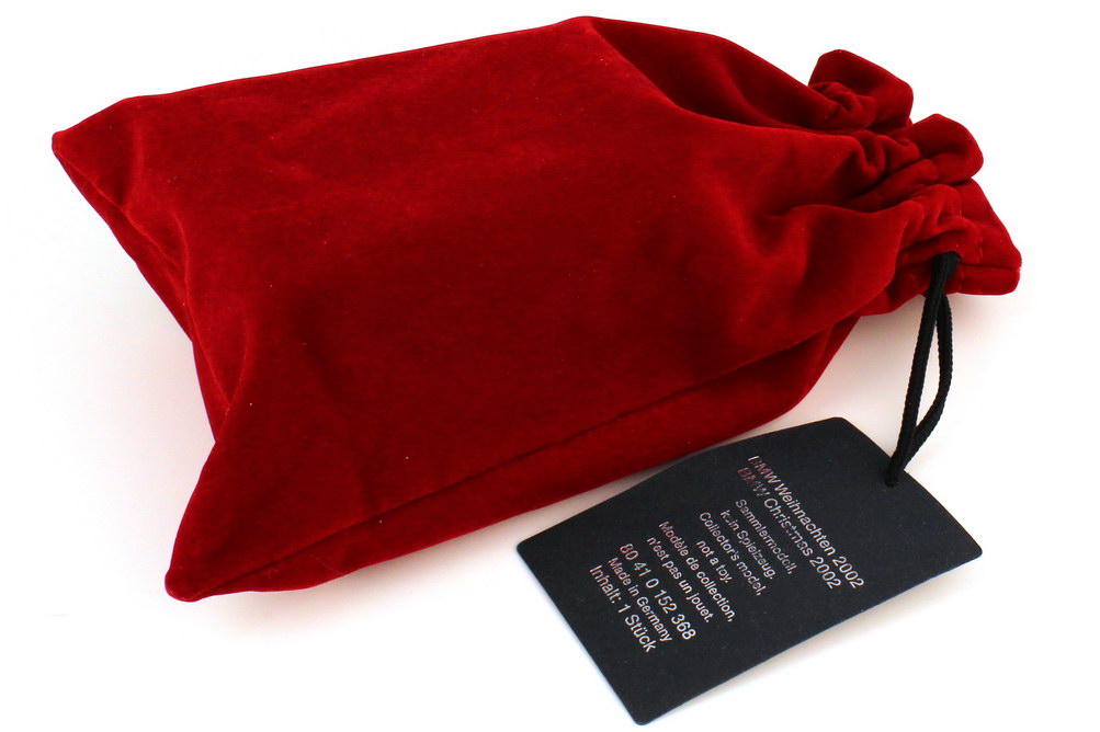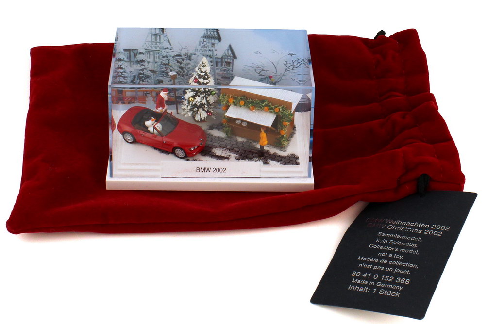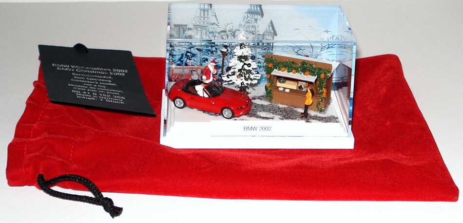 herpa-Modellauto in Minivitrine, M 1:87, BMW Z3 facelift rot "BMW Weihnachten 2002" mit Weihnachtsdiorama verpackt in rotem Säckchen (BMW-Werbemodell)