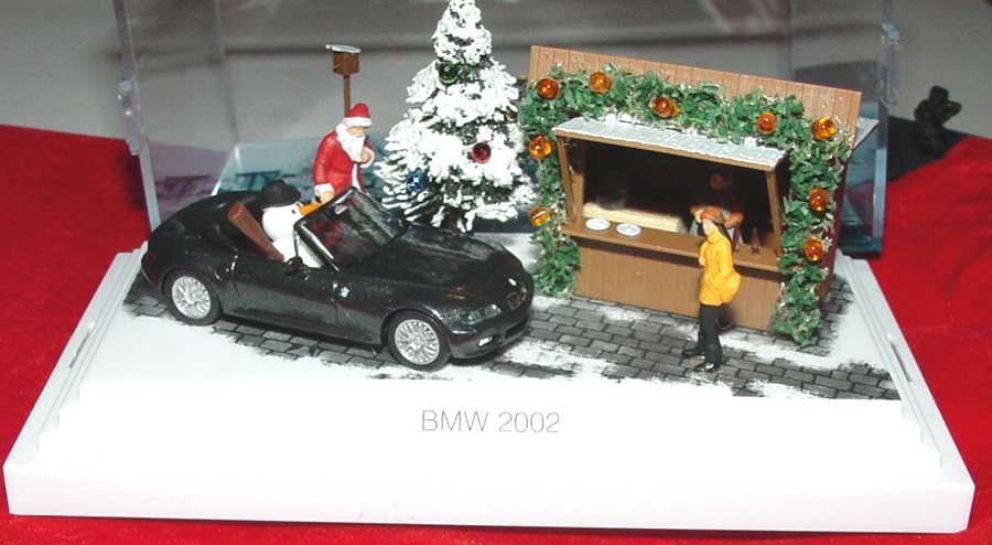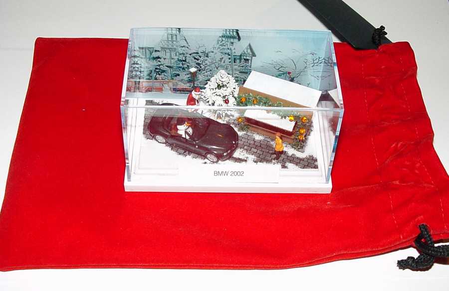 herpa-Modellauto in Minivitrine, M 1:87, BMW Z3 facelift schwarzmet. "BMW Weihnachten 2002" mit Weihnachtsdiorama verpackt in rotem Säckchen (BMW-Werbemodell)
