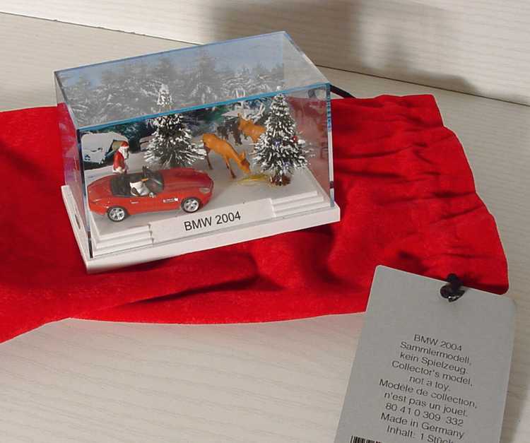 herpa-Modellauto in Minivitrine, M 1:87, BMW Z8 rot "BMW Weihnachten 2004" mit Weihnachtsdiorama verpackt in rotem Säckchen (BMW-Werbemodell)