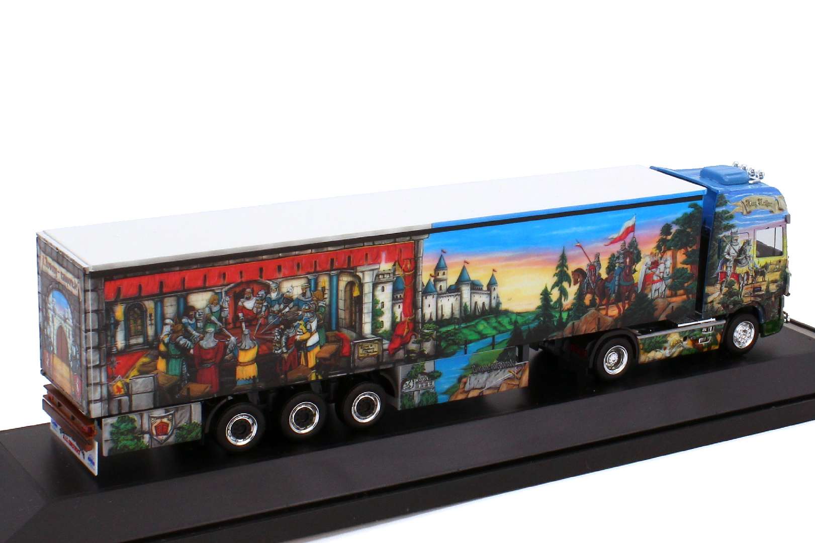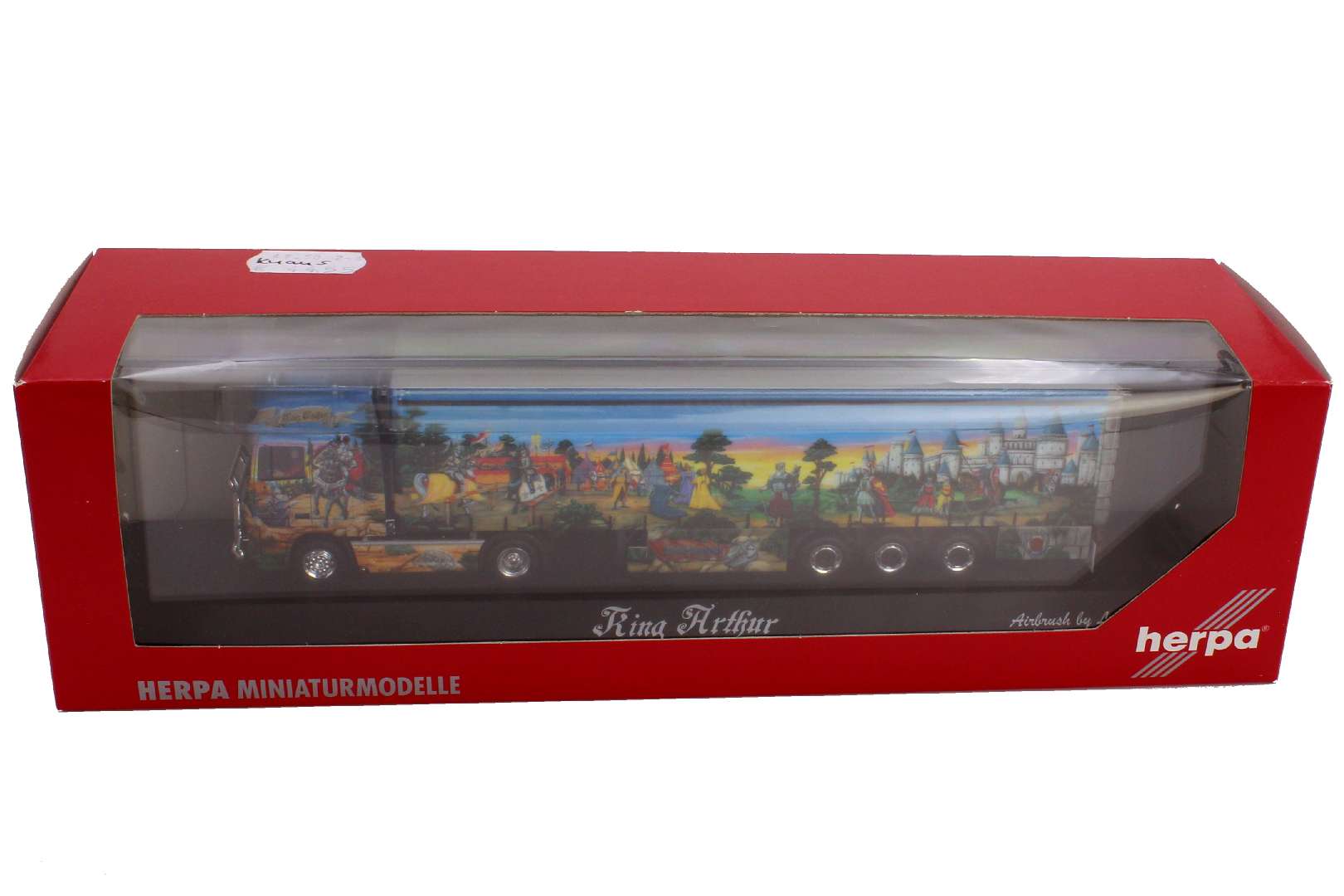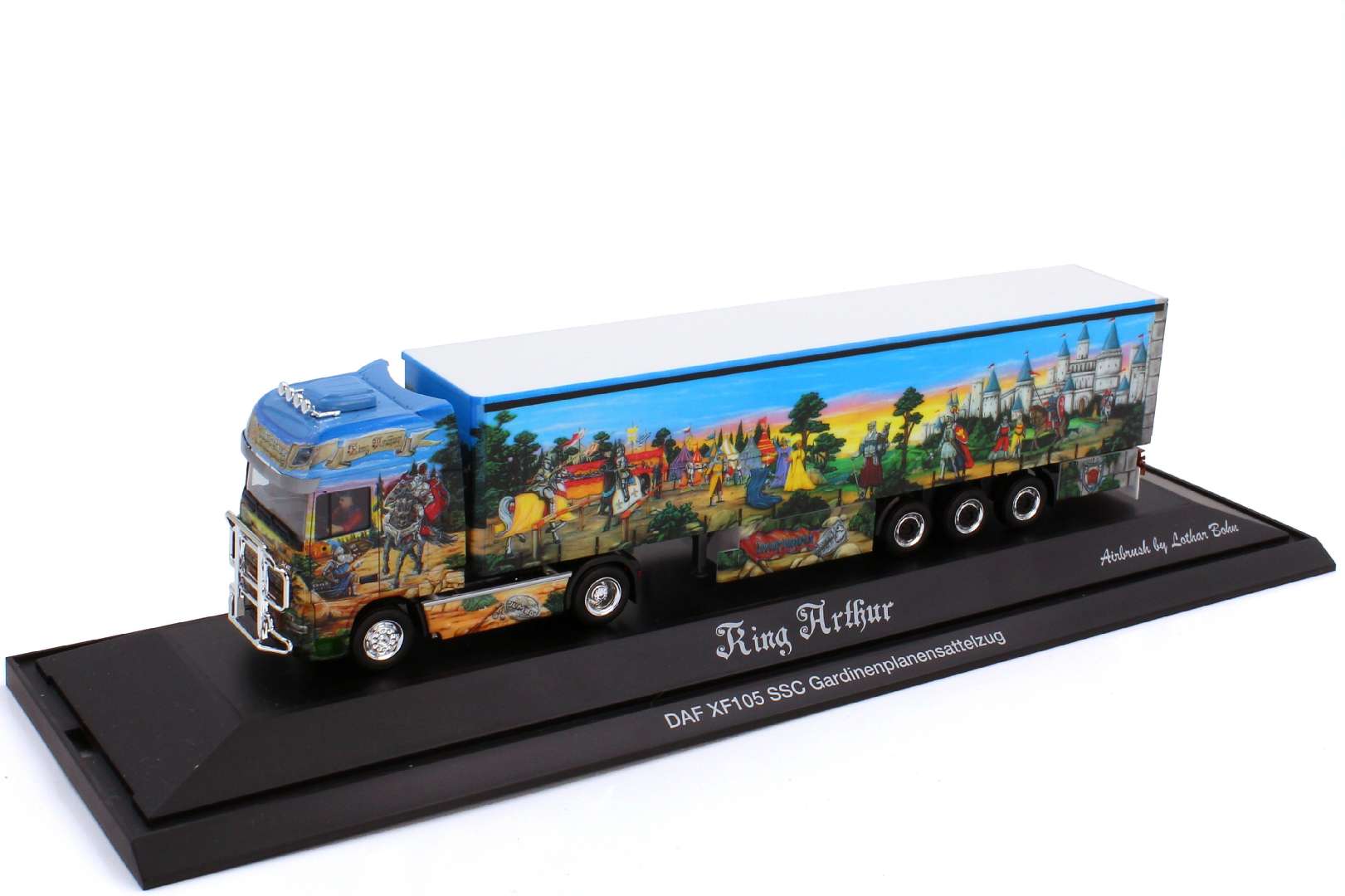 herpa-Modellauto in Minivitrine, M 1:87, DAF XF 105 Super Space Cab Gardinenplanen-Sattelzug 2/3 "Nowotny Transporte Ludwigsburg" Showtruck King Arthur, Airbrush by Lothar Bohn