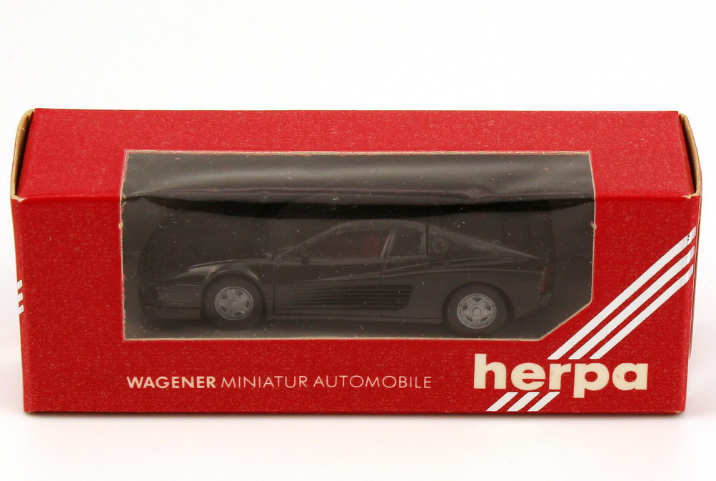 herpa-Modellauto, M 1:87, Ferrari Testarossa schwarz, rote Sichtfenster-Verpackung