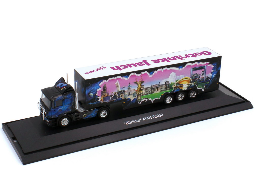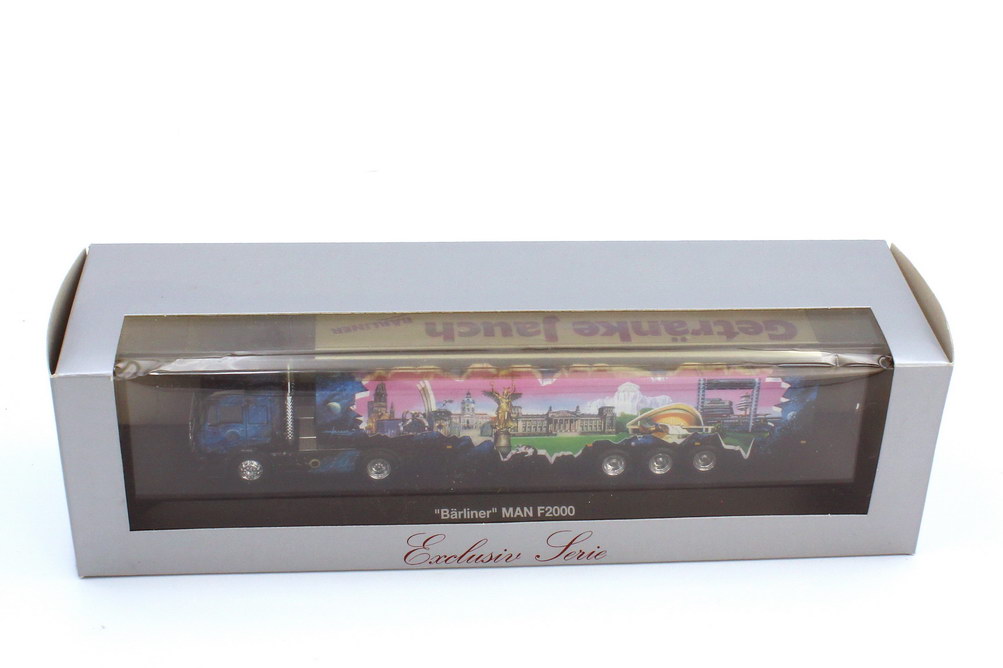 herpa-Modellauto in Minivitrine, M 1:87, MAN F2000 Fv Cv KoSzg Cv 2/3 "Getränke Jauch, Bärliner"