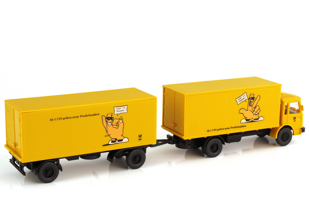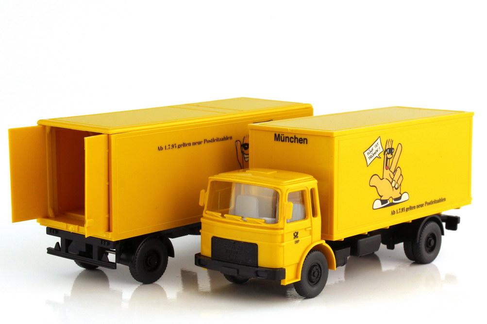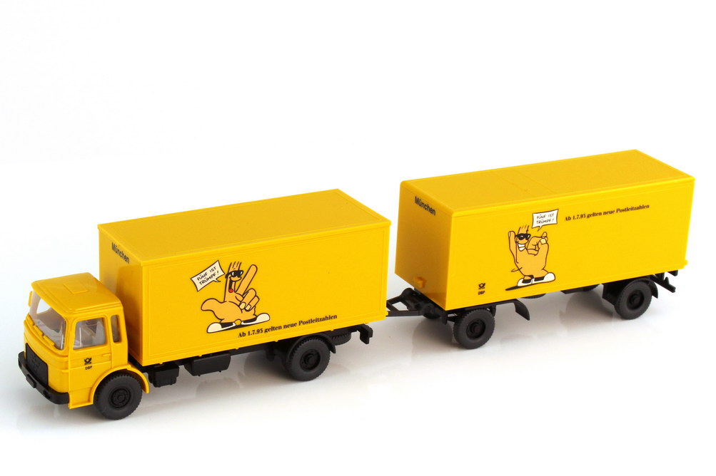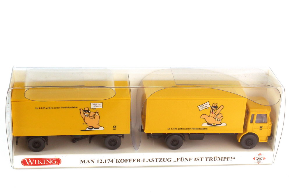 Wiking-Modellauto, M 1:87, MAN F8 12.174 (kurze Kabine) Koffer-Hängerzug 2/2 "Post DBP München, Fünf ist Trümpf, Ab 1.7.95 gelten neue Postleitzahlen", Sonderedition für Post Museums Shop