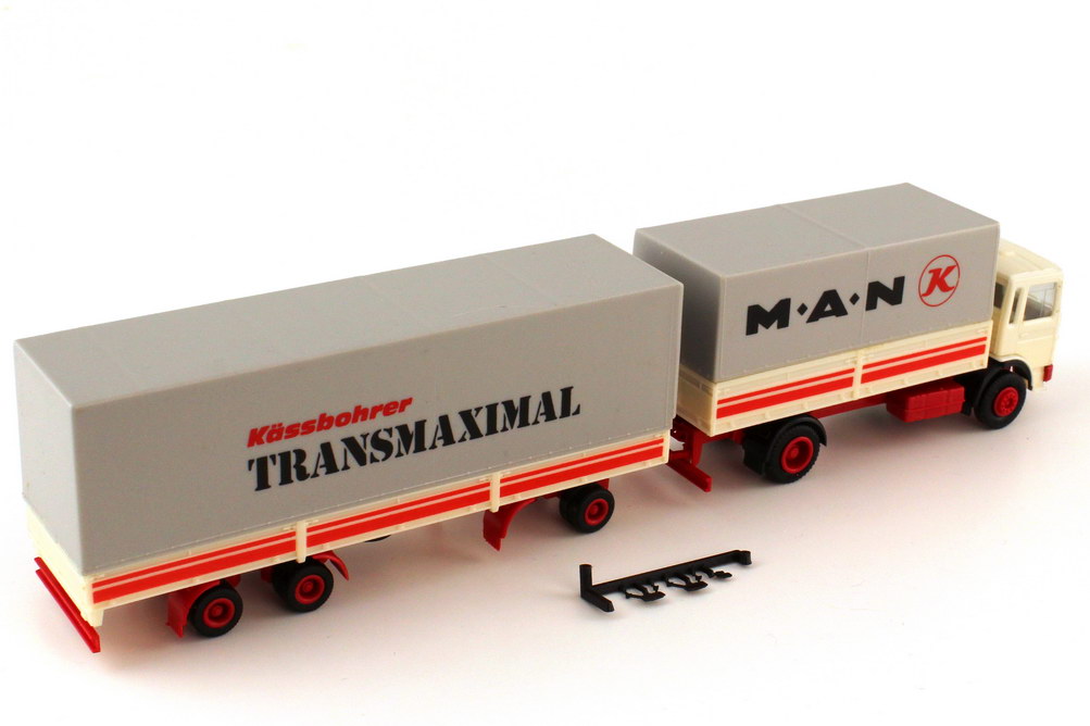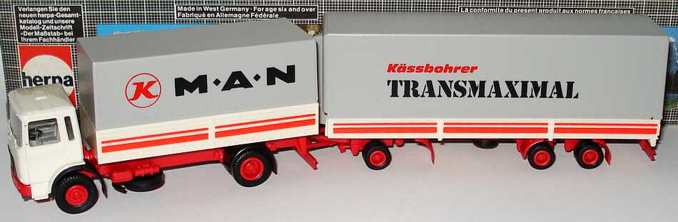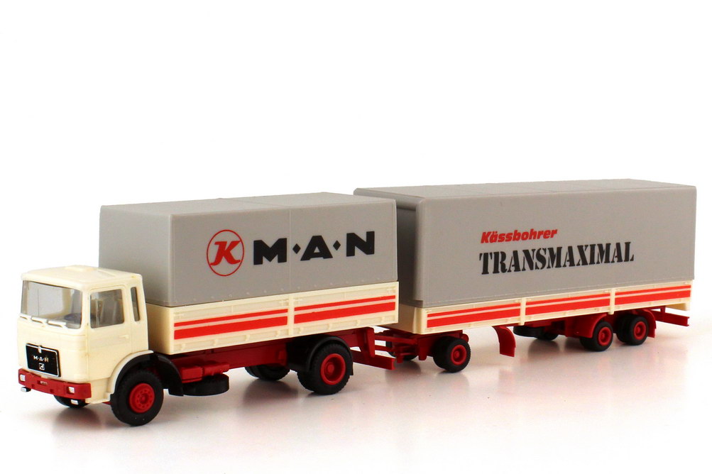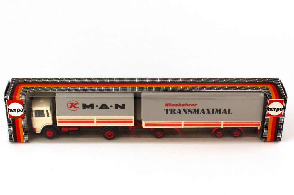 herpa-Modellauto, M 1:87, MAN F8 (kurze Kabine) Jumbo-Pritsche/Plane-Hängerzug 2/3 "MAN, Kässbohrer Transmaximal"