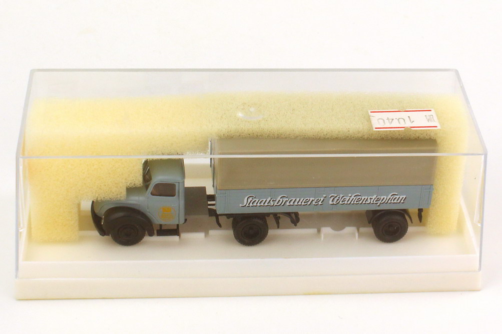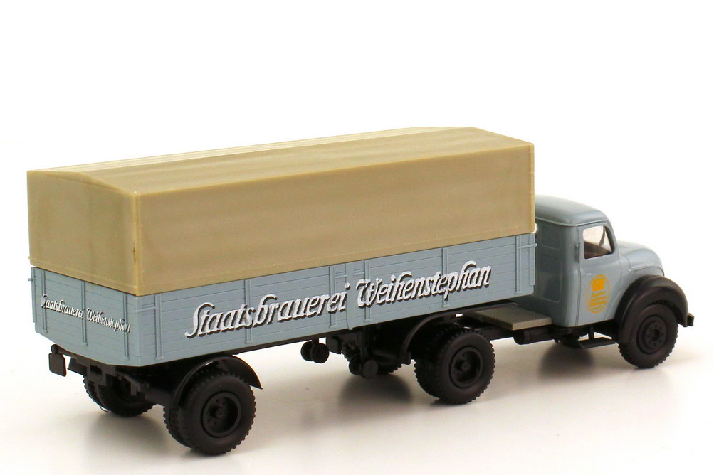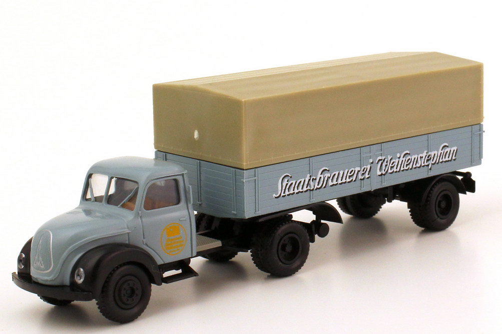 Brekina-Modellauto, M 1:87, Magirus Mercur Pritsche/Plane-Sattelzug 2/1 "Staatsbrauerei Weihenstephan"
