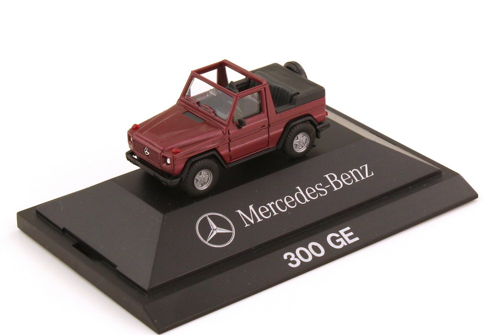 herpa-Modellauto in Minivitrine, M 1:87, Mercedes-Benz G-Modell Cabrio 300GE (W463) almadinrot-met. (Mercedes-Werbemodell)