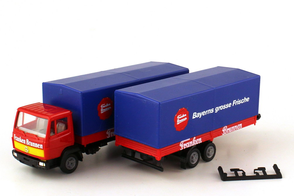 herpa-Modellauto, M 1:87, Mercedes-Benz 814 Pritsche-Plane-Tandem-Hängerzug 2/2 "Franken Brunnen, Bayerns grosse Frische"