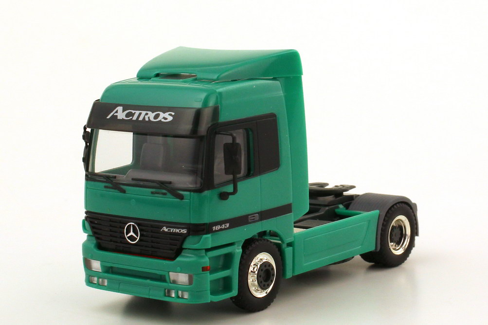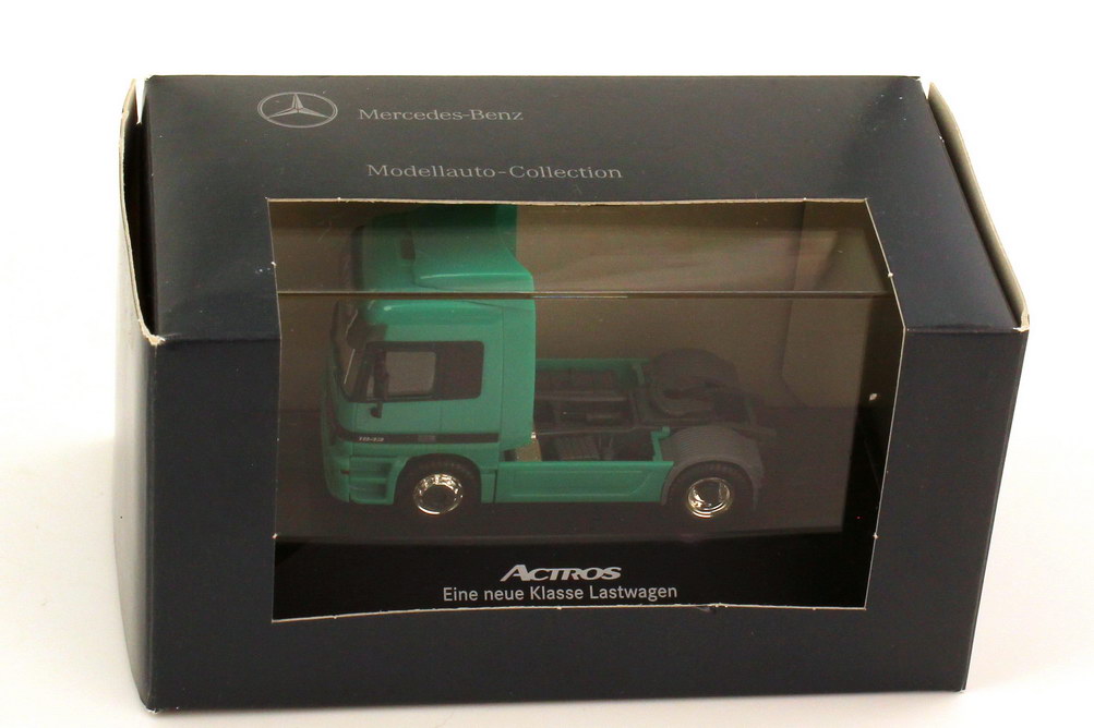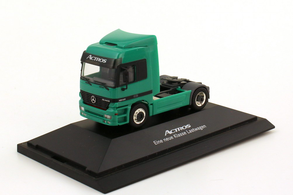 herpa-Modellauto in Minivitrine, M 1:87, Mercedes-Benz Actros L 1843 LS mit Vollverkleidung 2achs Sattelzugmaschine saftgrün "Eine neue Klasse Lastwagen" (Mercedes-Werbemodell)