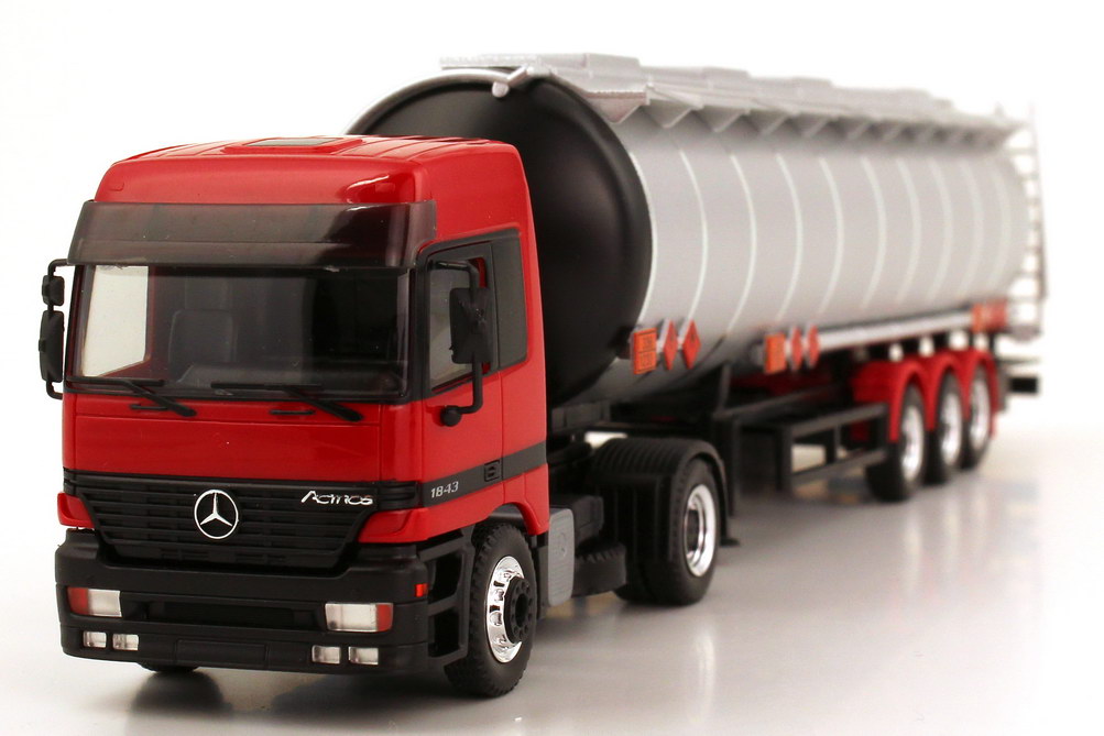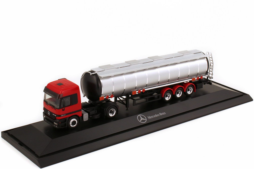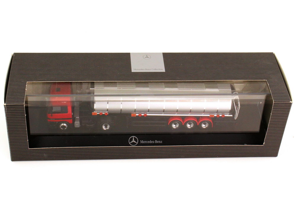 herpa-Modellauto in Minivitrine, M 1:87, Mercedes-Benz Actros L JumboTank-Sattelzug 2/3 rot/mattverchromt (Mercedes-Werbemodell)