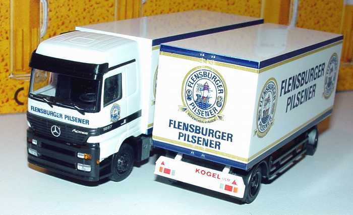 Albedo-Modellauto, M 1:87, Mercedes-Benz Actros LH Kofferhängerzug 3/2 "Flensburger Pilsener"