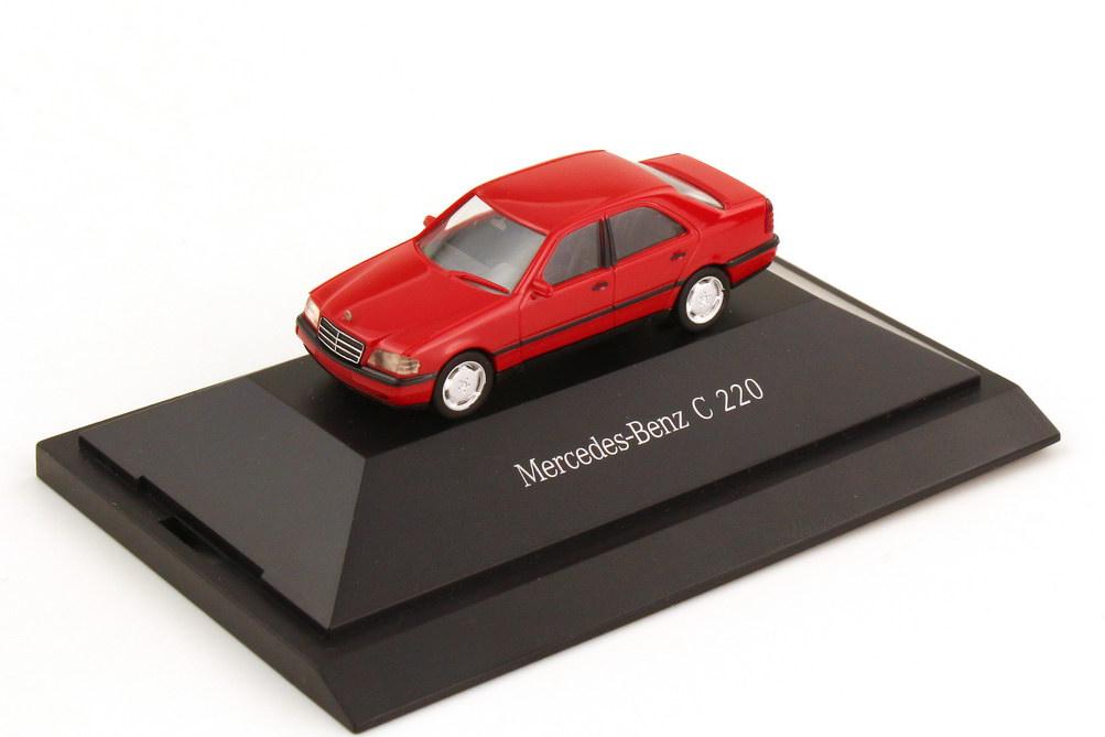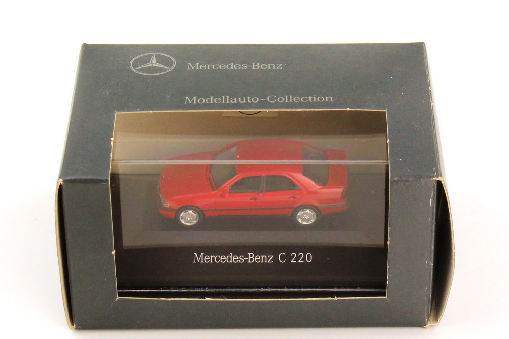 herpa-Modellauto in Minivitrine, M 1:87, Mercedes-Benz C-Klasse (W202) C 220 imperialrot (Mercedes-Werbemodell)