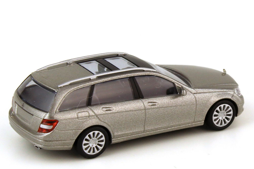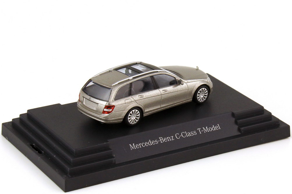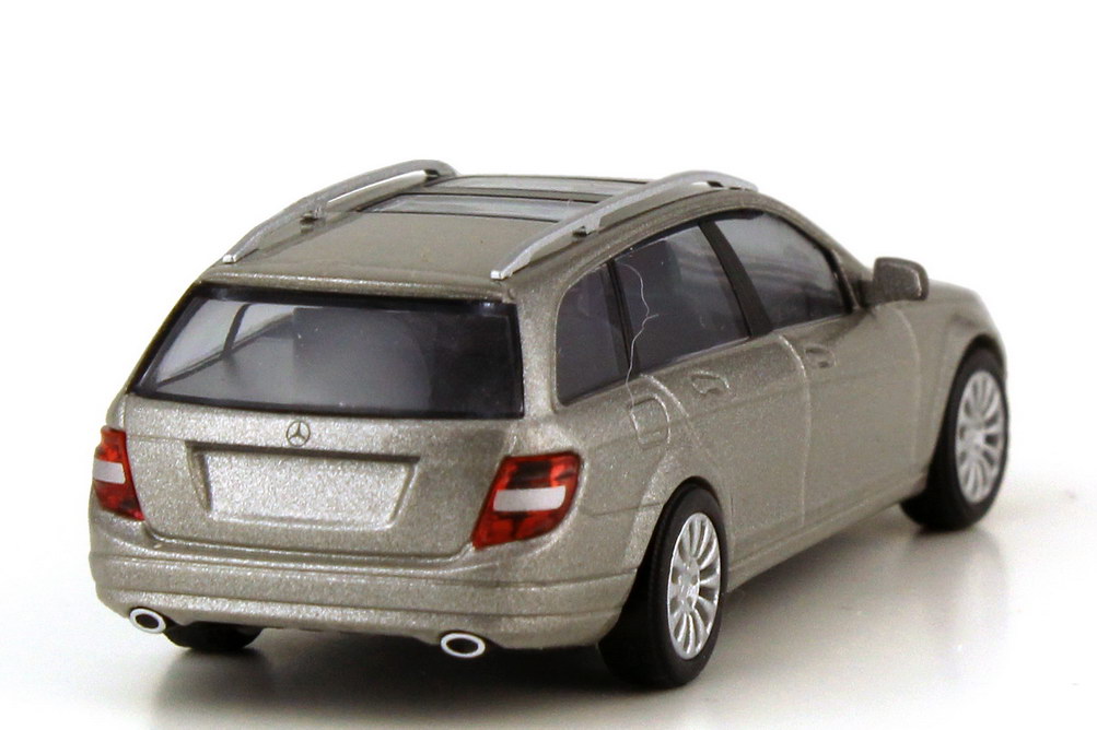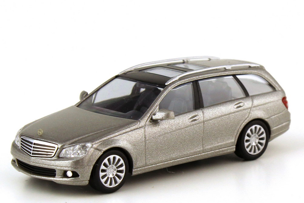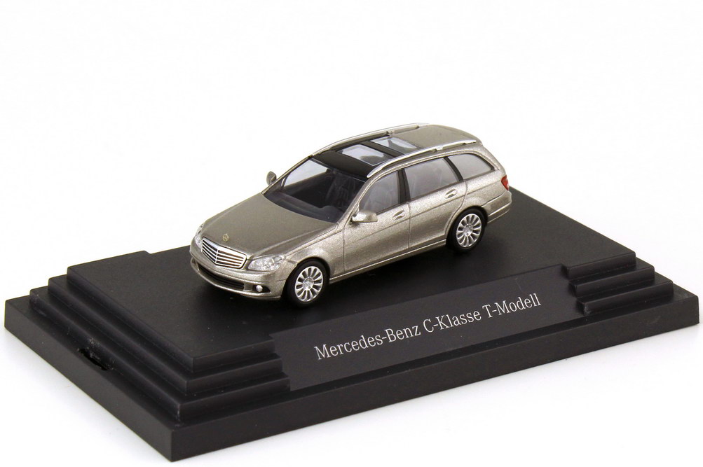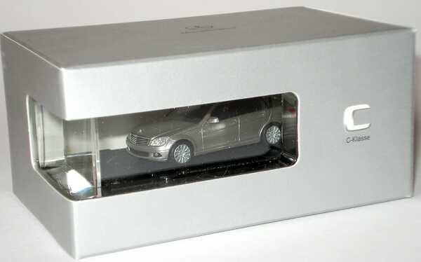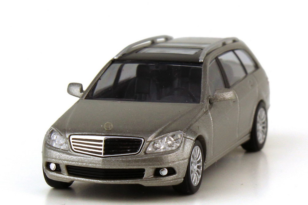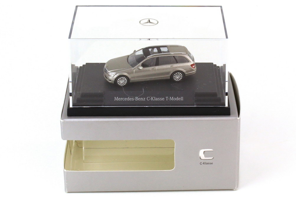 Busch-Modellauto in Minivitrine, M 1:87, Mercedes-Benz C-Klasse T-Modell Elegance (S204) cubanitsilber-met. (Mercedes-Werbemodell)
