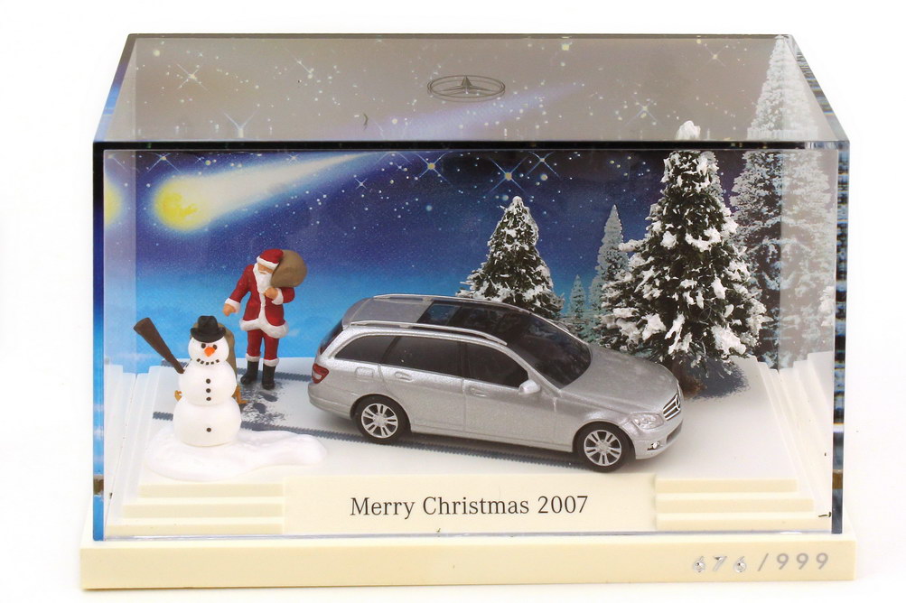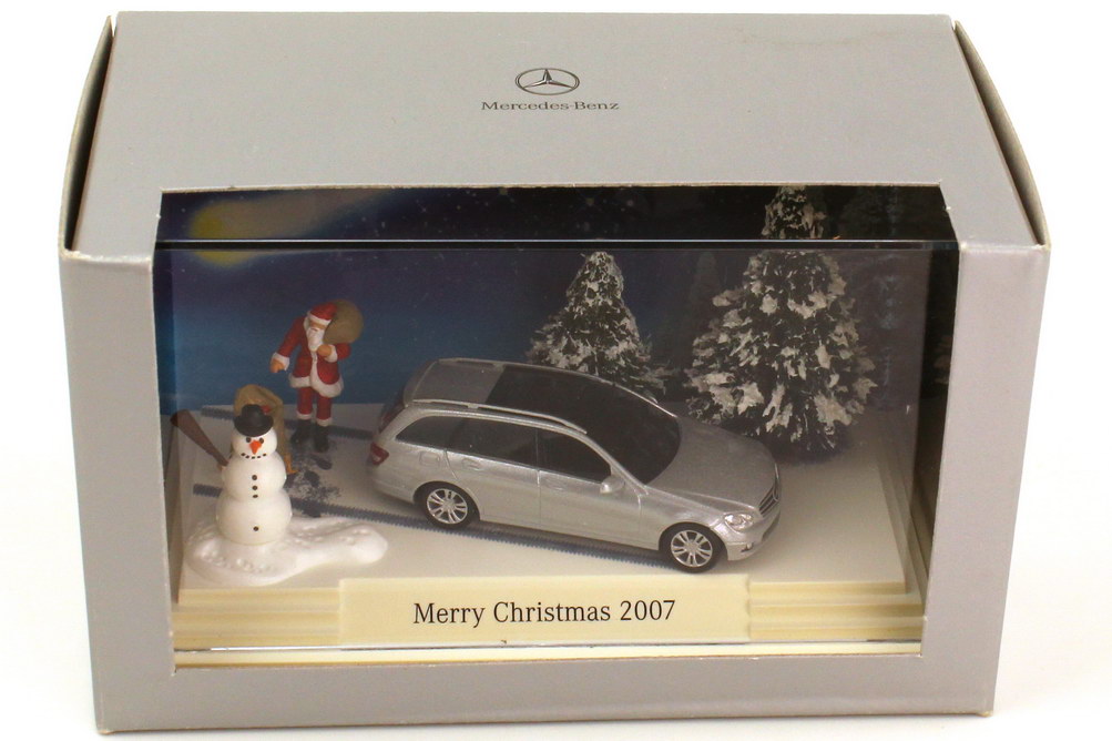 Busch-Modellauto in Minivitrine, M 1:87, Mercedes-Benz C-Klasse T-Modell Avantgarde (S204) iridiumsilbermet., Minidiorama "Merry Christmas 2007" (Mercedes-Werbemodell), Auflage 999 Stück