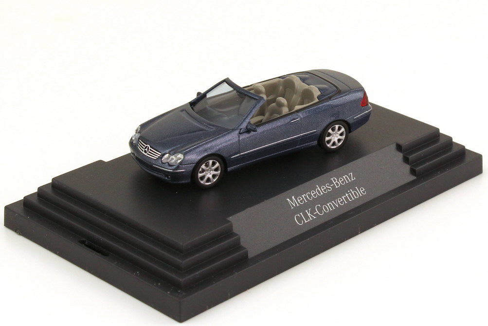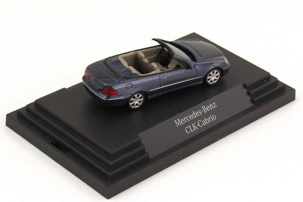 Busch-Modellauto in Minivitrine, M 1:87, Mercedes-Benz CLK Cabrio (A209) tansanitblau-met. (Mercedes-Werbemodell)