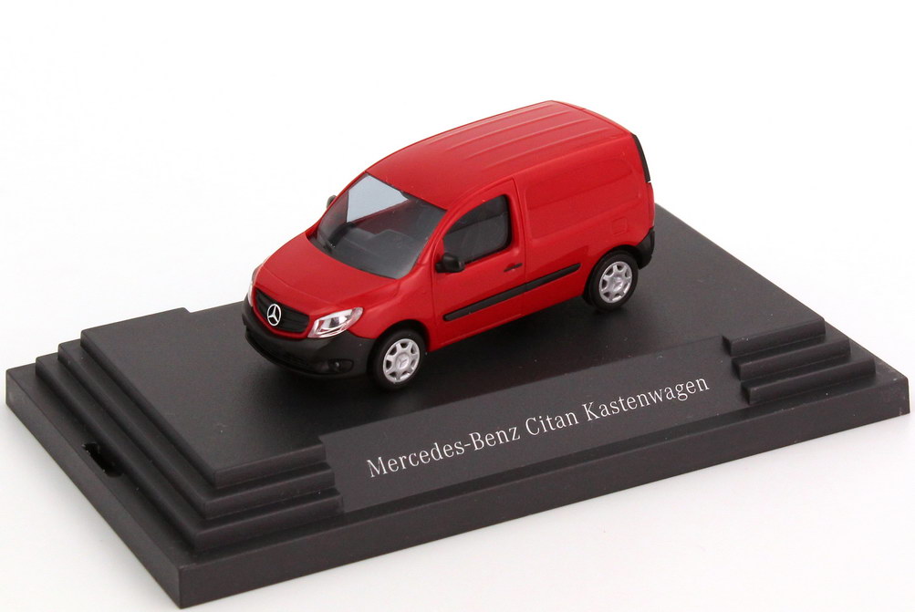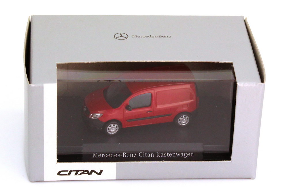 Busch-Modellauto in Minivitrine, M 1:87, Mercedes-Benz Citan (C415) Kasten amarena-rot (Mercedes-Werbemodell)