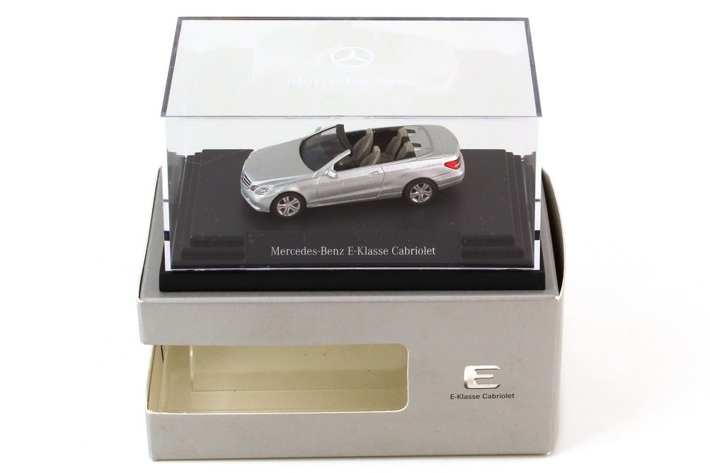 Busch-Modellauto in Minivitrine, M 1:87, Mercedes-Benz E-Klasse Cabrio (A207) iridiumsilber-met. (Mercedes-Werbemodell)