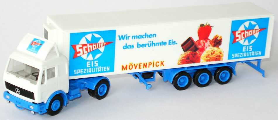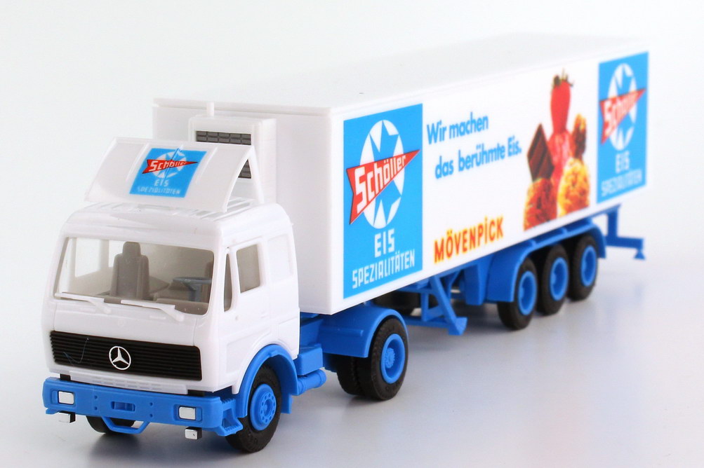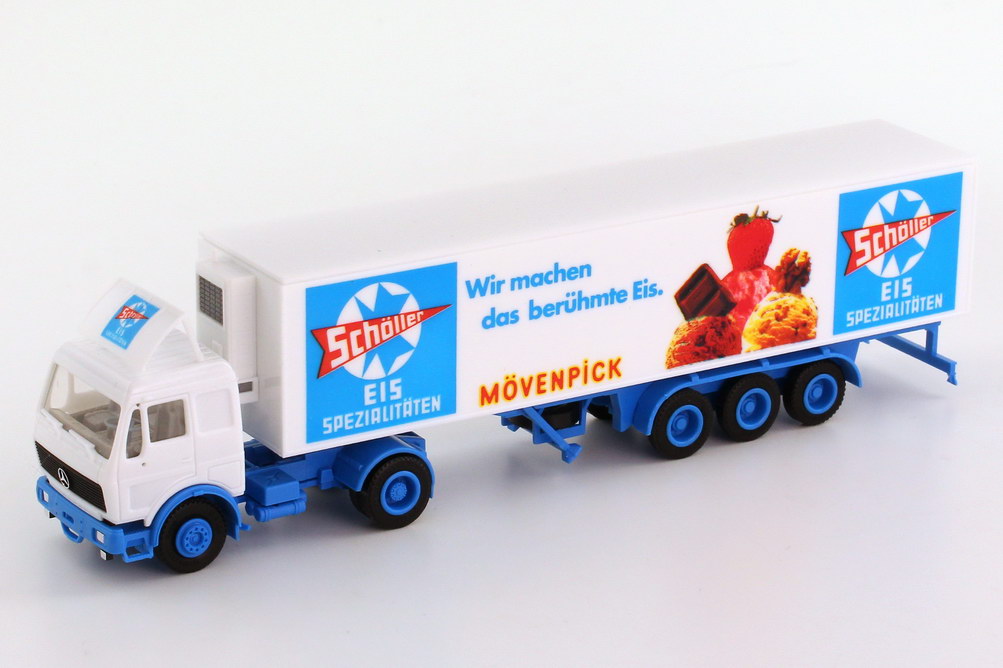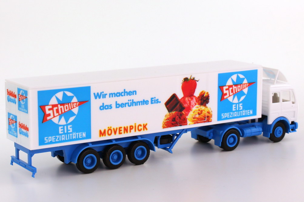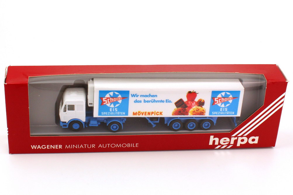 Herpa Modellauto, M 1:87, Mercedes-Benz Kühlkoffersattelzug 2/3 "Schöller Mövenpick"