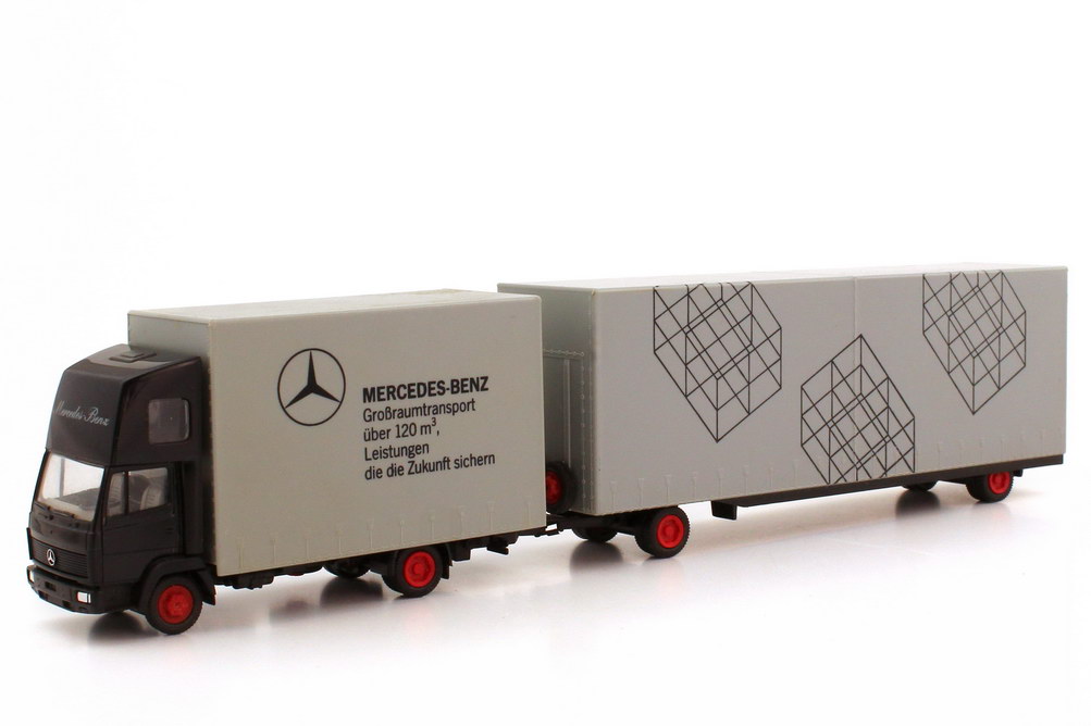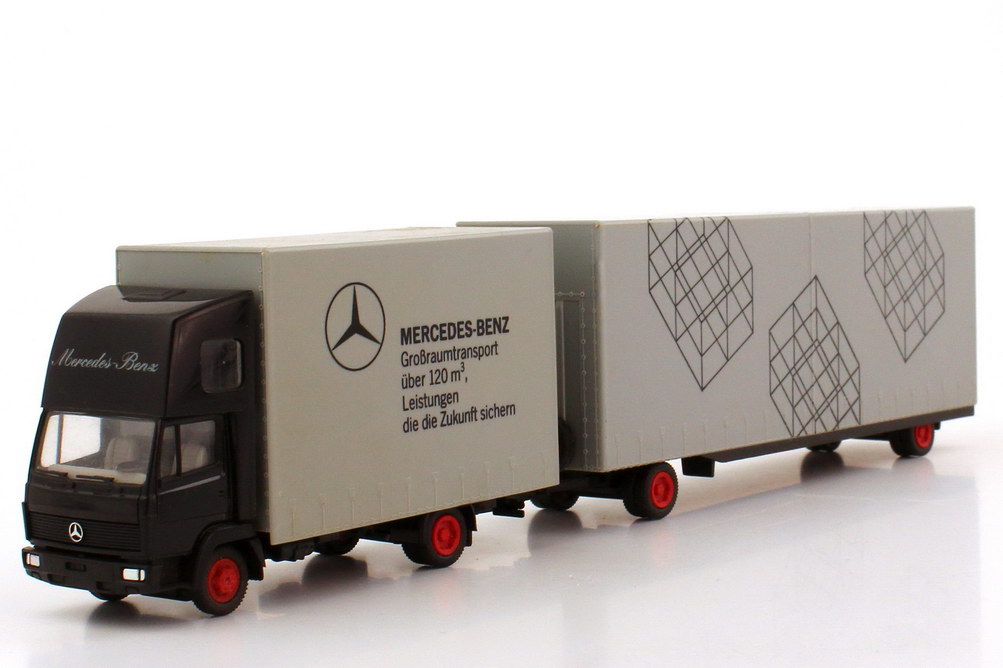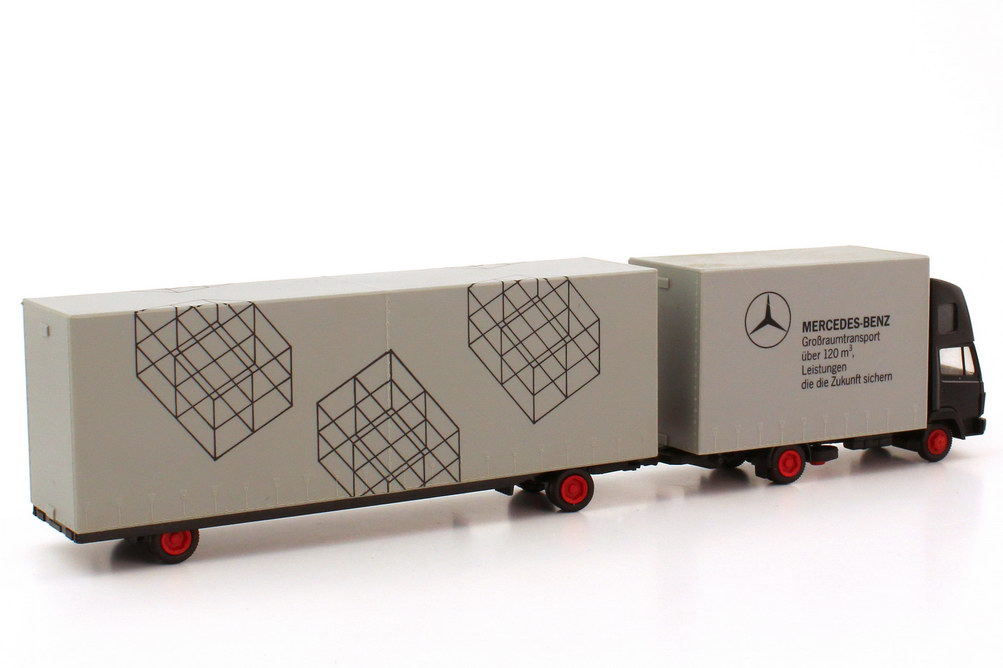 herpa-Modellauto, M 1:87, Mercedes-Benz LN2 814 Topsleeper Jumbo-Pritsche/Plane-Hängerzug 2/2 "Mercedes-Benz Großraumtransport über 120 m³, Leistungen die die Zukunft sichern" schwarz/grau