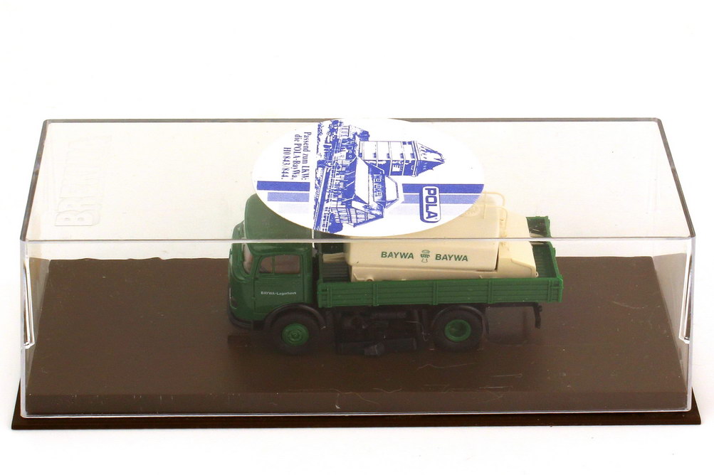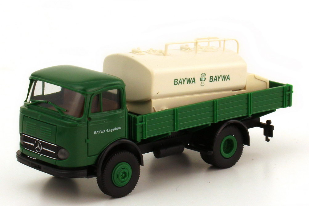 Brekina-Modellauto, M 1:87, Mercedes-Benz LP 328 Pritschen-Lkw mit Aufsatz-Tank "BAYWA"