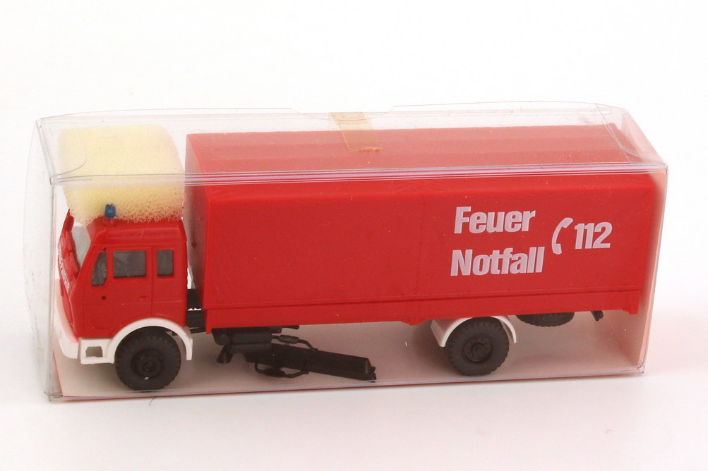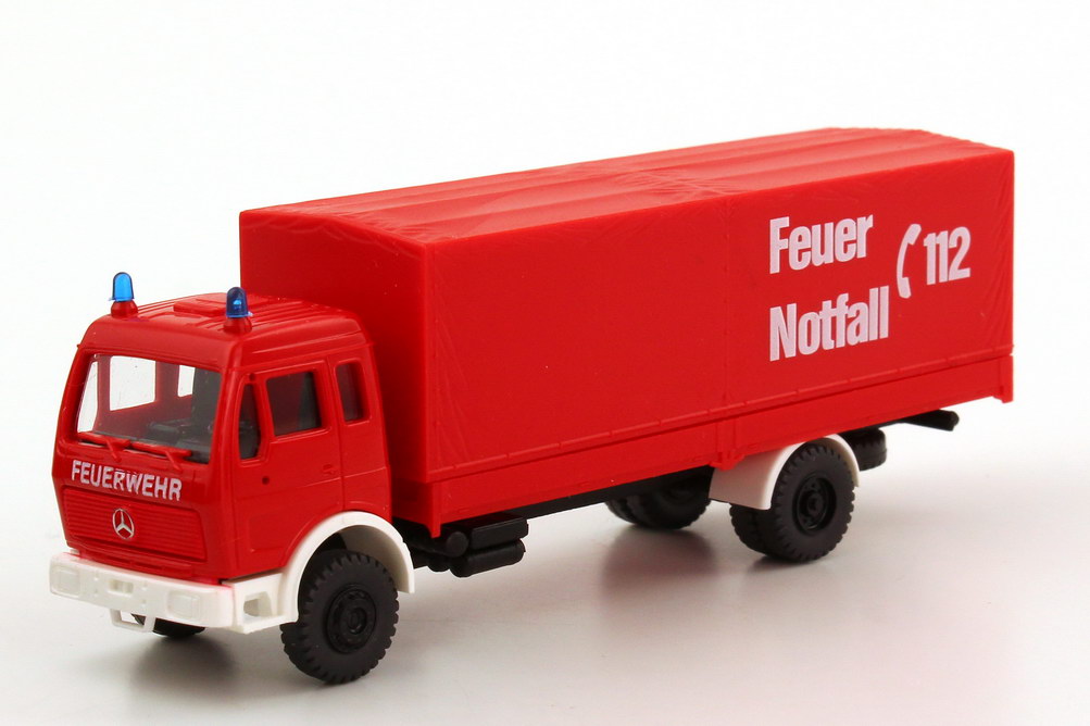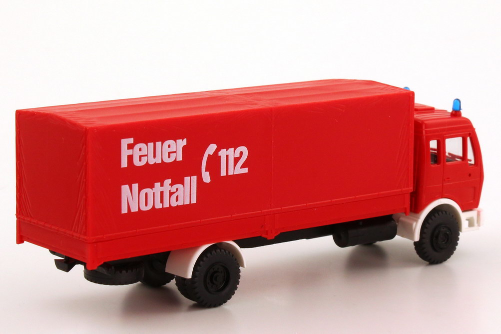 Roskopf-Modellauto, M 1:87, Mercedes-Benz NG 1625 (mittellange Kabine) 2achs Lkw Pritsche/Plane "Feuerwehr Notfall 112" rot