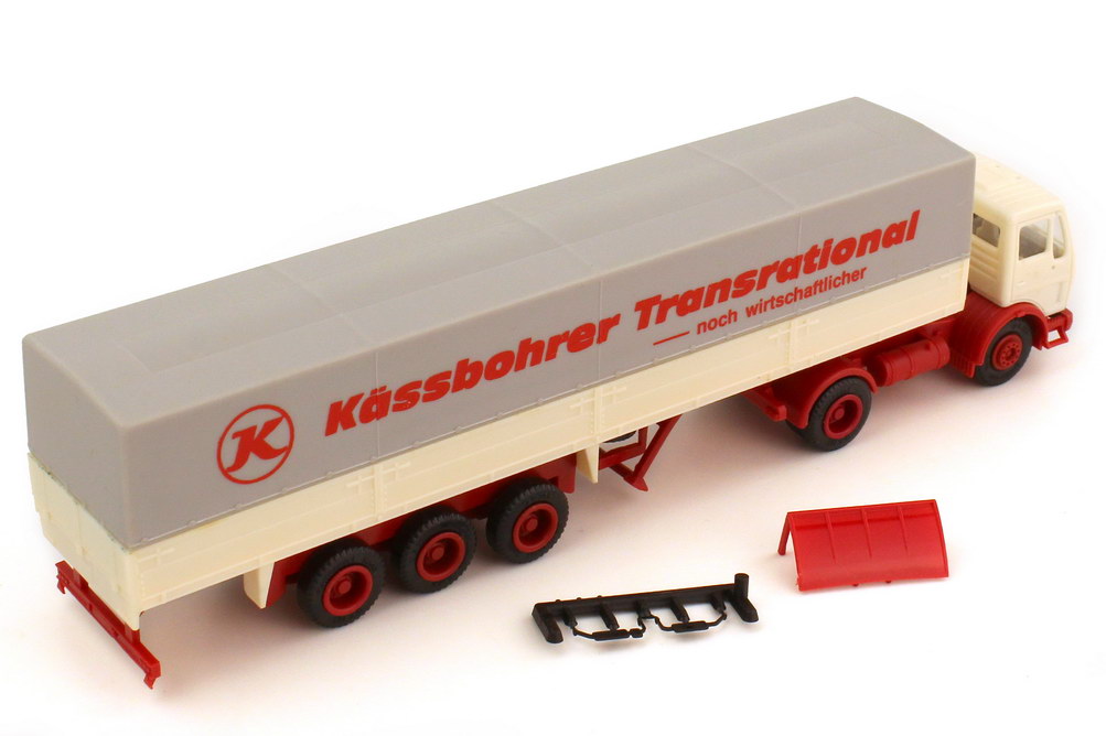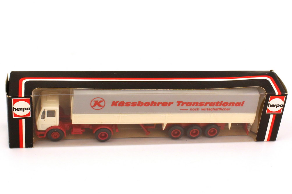 herpa-Modellauto, M 1:87, Mercedes-Benz NG (kurze Kabine) Pritsche/Plane-Sattelzug 2/3 "Kässbohrer Transrational - noch wirtschaftlicher"