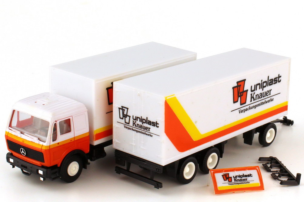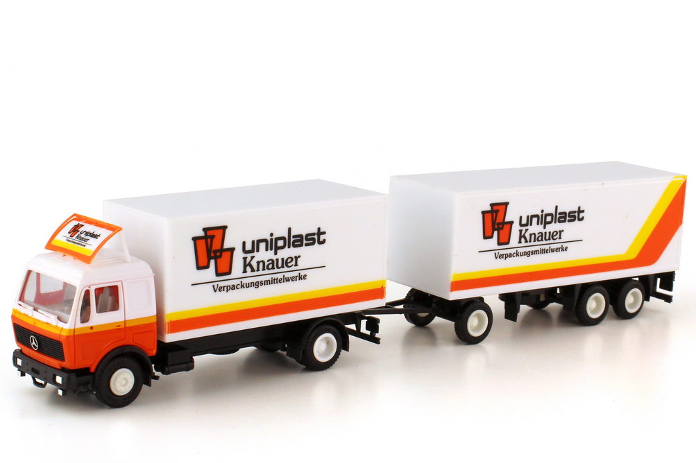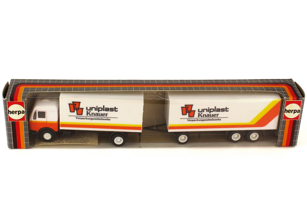 herpa-Modellauto, M 1:87, Mercedes-Benz NG Koffer-Hängerzug 2/3 "uniplast Knauer Verpackungsmittelwerke"