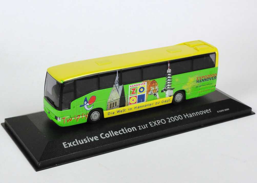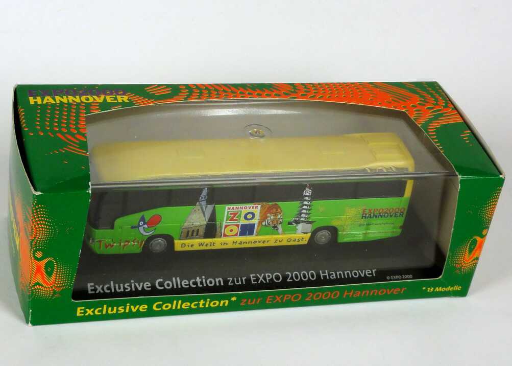 Rietze-Modellauto in Minivitrine, M 1:87, Mercedes-Benz O 404 RHD "Expo 2000, Hannover Zoo"