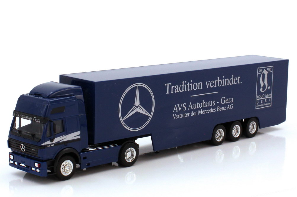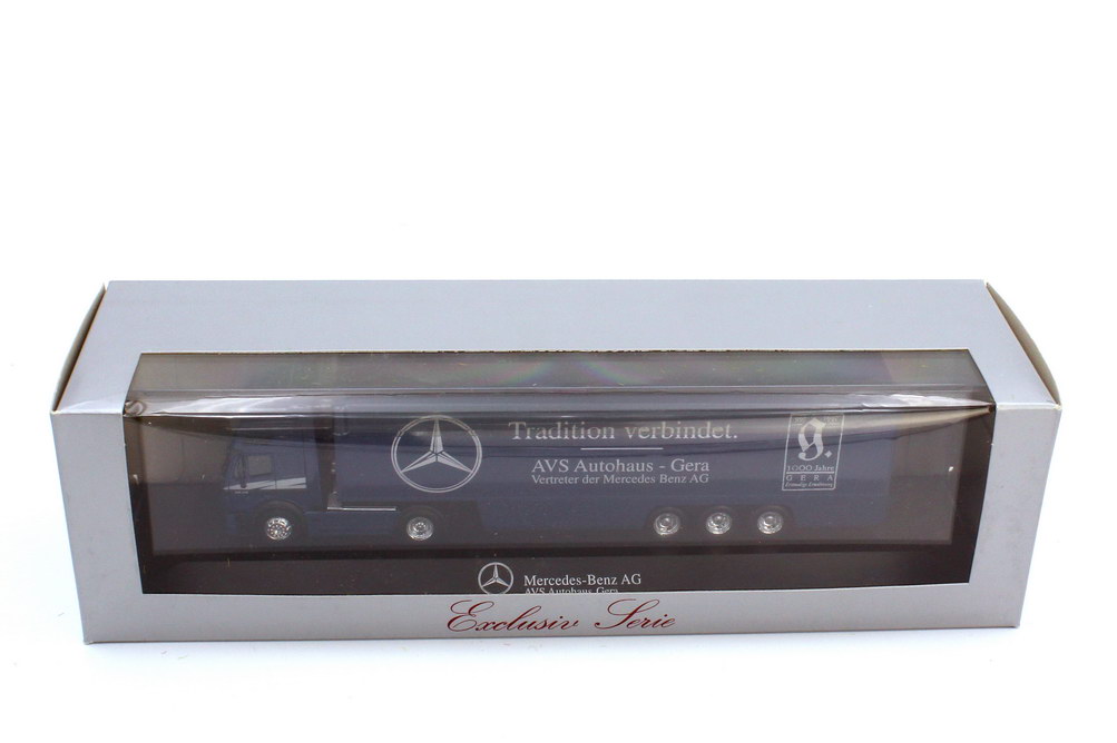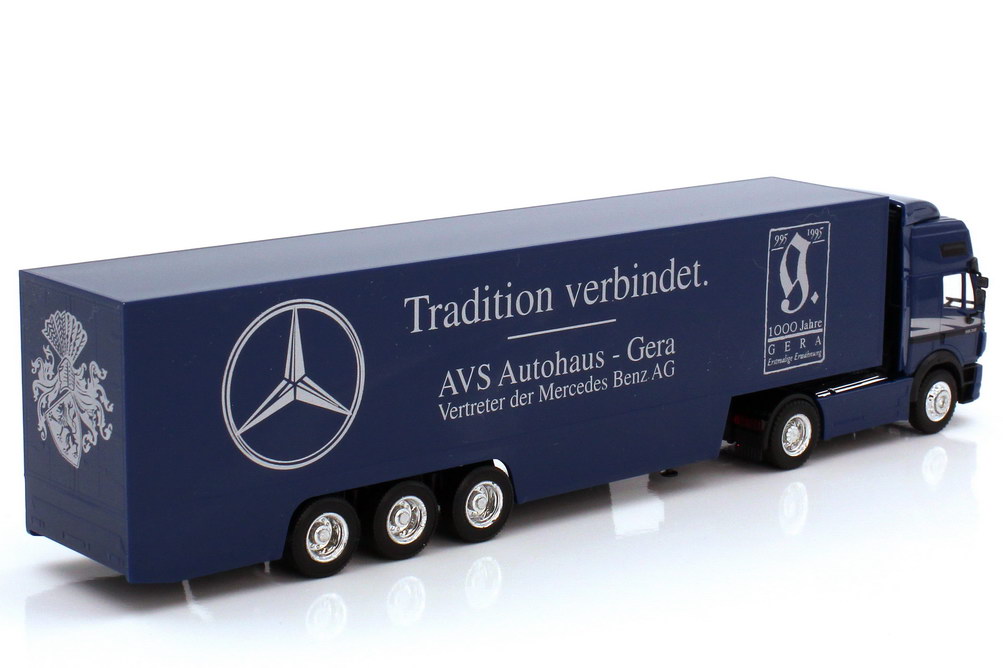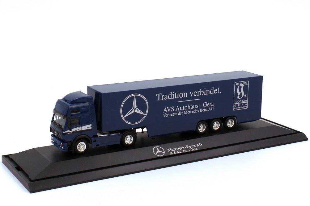 herpa-Modellauto in Minivitrine, M 1:87, Mercedes-Benz SK 94 Eurocab Fv Cv Koffer-Sattelzug Cv 2/3 "Tradition verbindet. AVS Autohaus Gera"