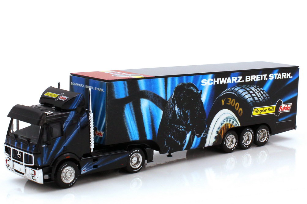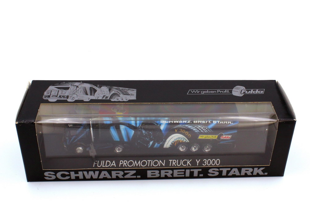 herpa-Modellauto in Minivitrine, M 1:87, Mercedes-Benz SK 88 Fv Cv Koffer-Sattelzug Cv 2/3 "Fulda Promotion Truck Y 3000, Schwarz. Breit. Stark."