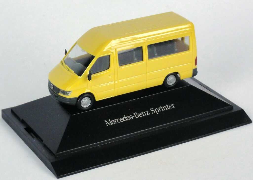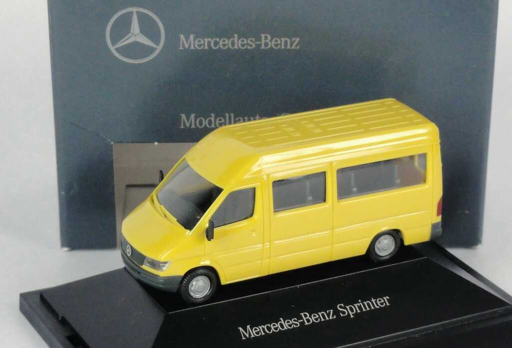 herpa-Modellauto in Minivitrine, M 1:87, Mercedes-Benz Sprinter Bus Hochdach gelb (Mercedes Werbemodell)