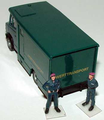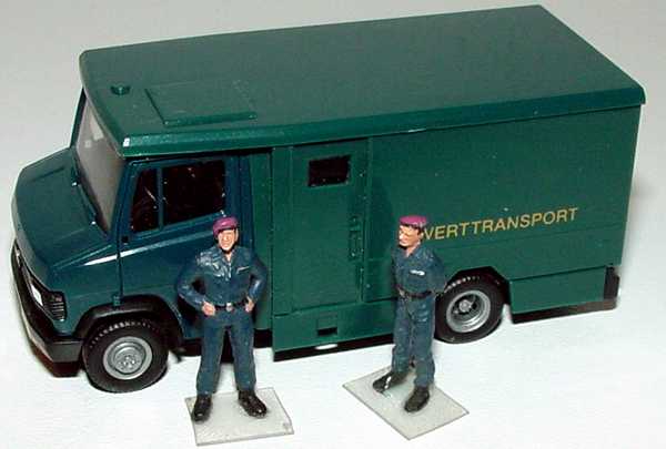1:87 Mercedes-Benz T2 Geldtransporter "Werttransport" dunkelgrün mit Wachpersonal herpa