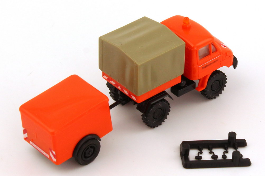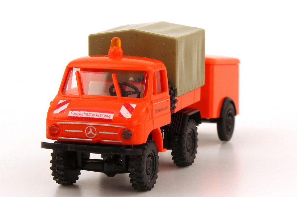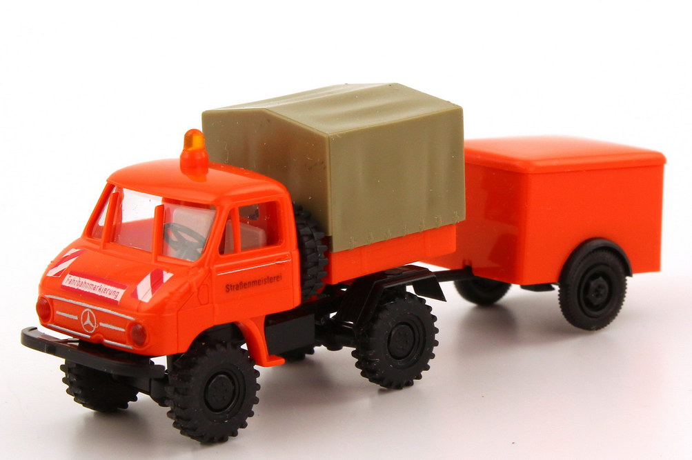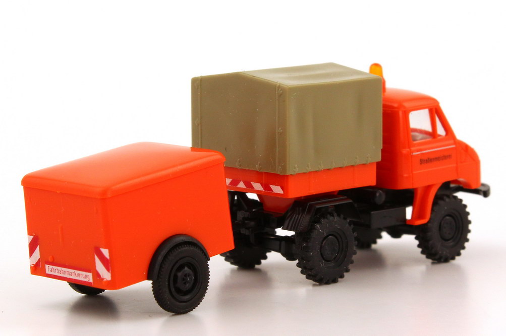 1:87 Mercedes-Benz Unimog 411 mit Pritsche/Plane mit Anhänger orange "Straßenmeisterei, Fahrbahnmarkierung" Brekina 39106