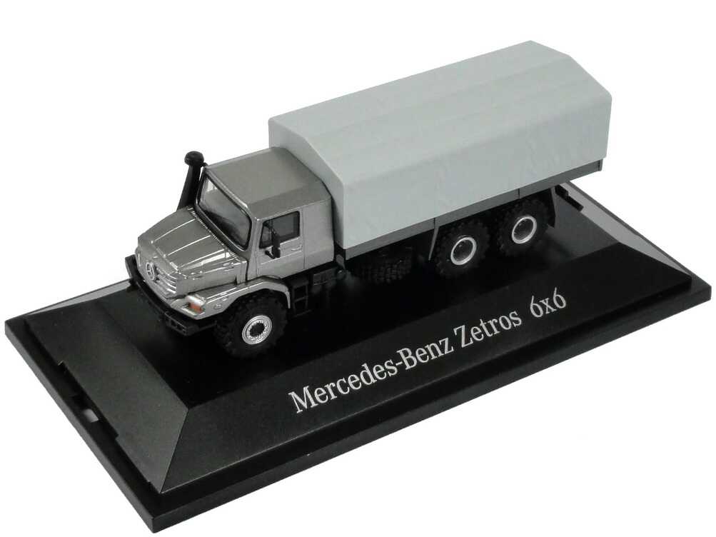 Cursor-Modellauto in Minivitrine, M 1:87, Mercedes-Benz Zetros 6x6 Pritsche/Plane silber-met. (Mercedes-Werbemodell)