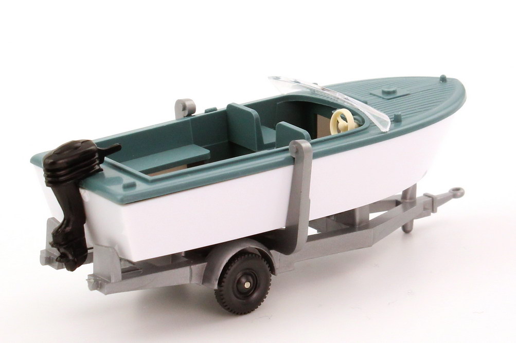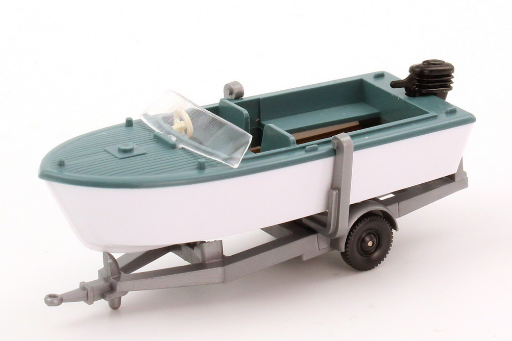 Wiking-Modellauto, M 1:87, Motorboot auf Anhänger 1achsig grün-blau/weiß