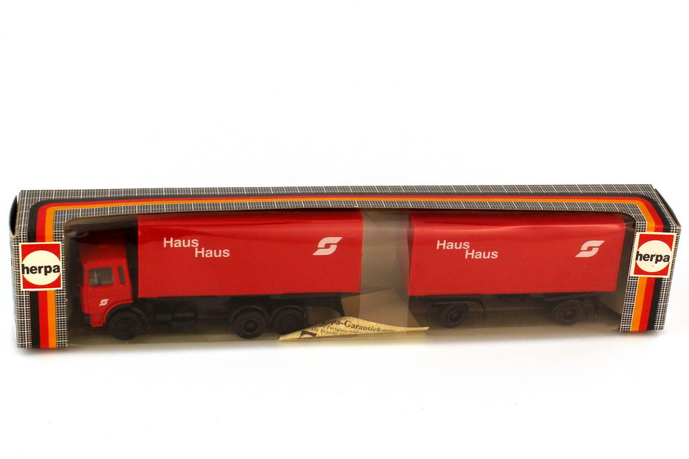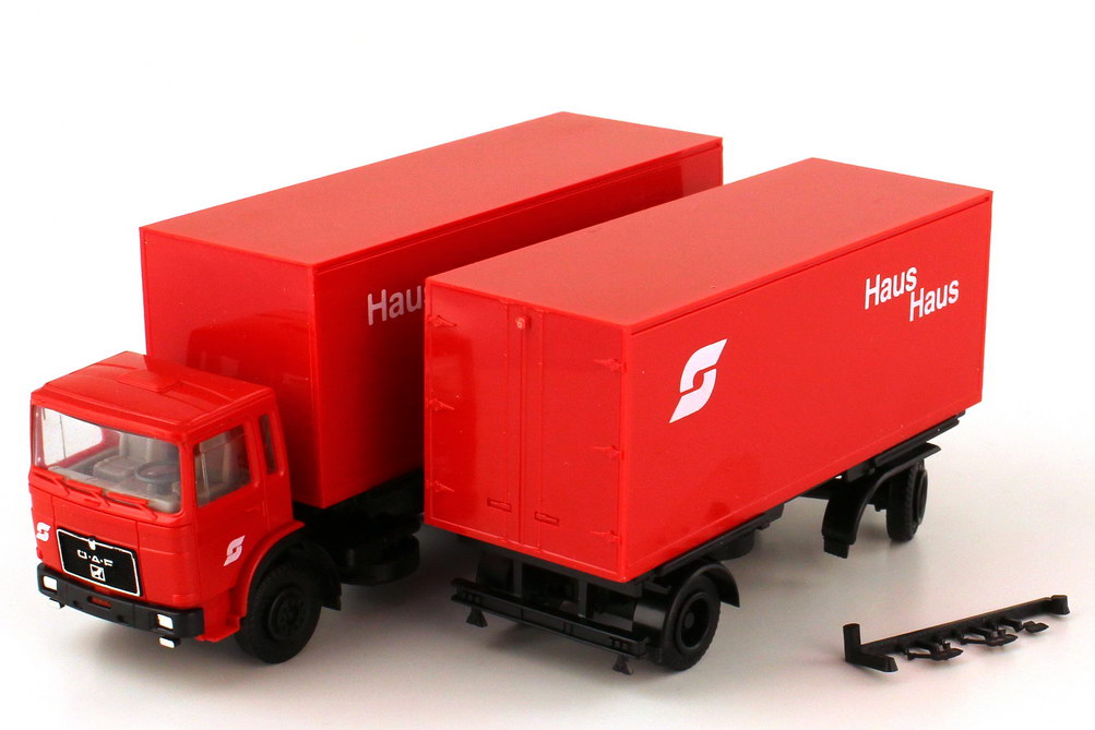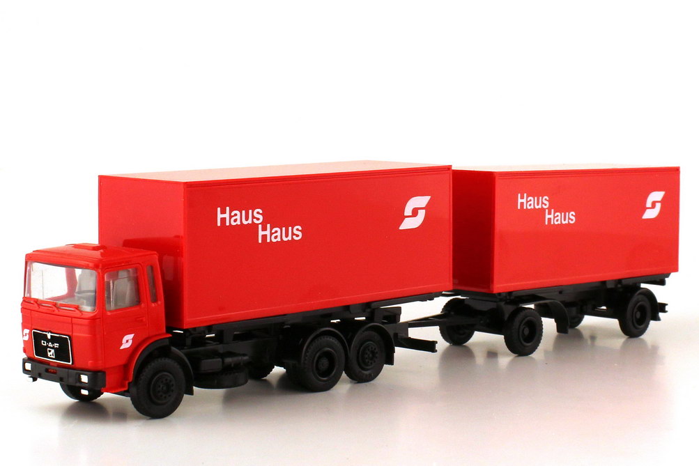 herpa-Modellauto, M 1:87, ÖAF F8 (kurze Kabine) Wechselkoffer-Hängerzug 3/2 "ÖBB Haus Haus"