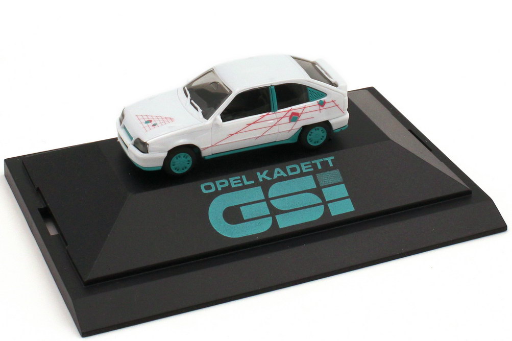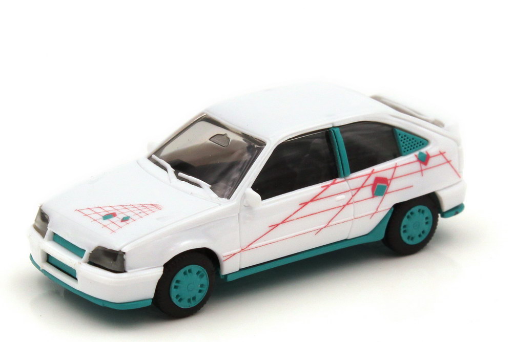 1:87 Opel Kadett E GSi weiß mit Grafik-Design Felgen türkis - de Kleine - herpa