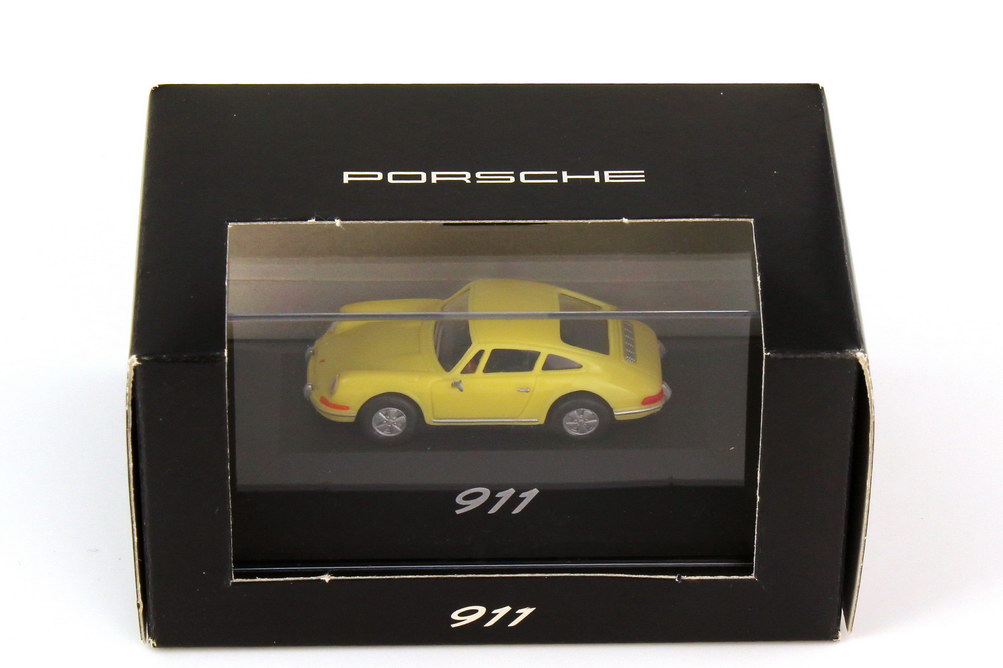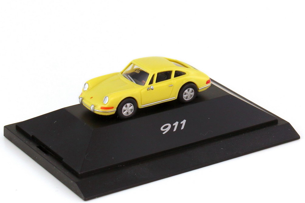 herpa-Modellauto in Minivitrine, M 1:87, Porsche 911 (Urmodell) hellgelb (Porsche-Werbemodell)