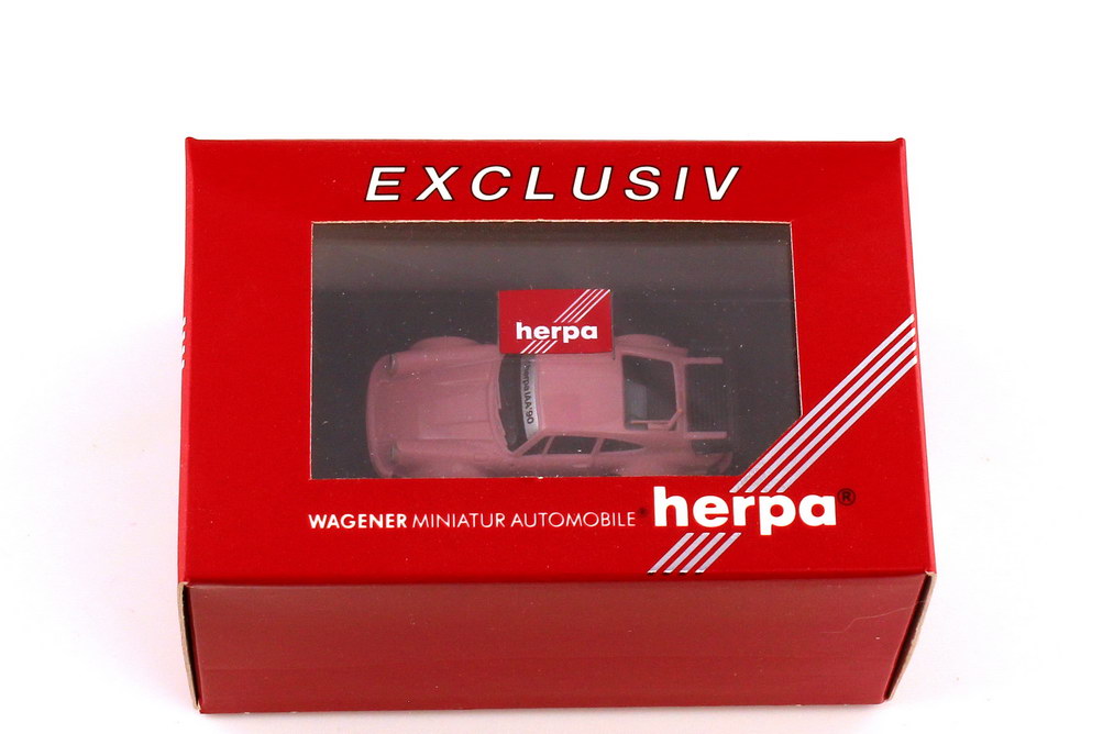 herpa-Modellauto in Minivitrine, M 1:87, Porsche 911 turbo (Typ 930) rosa "Messemodell 7. herpa IAA 1990"