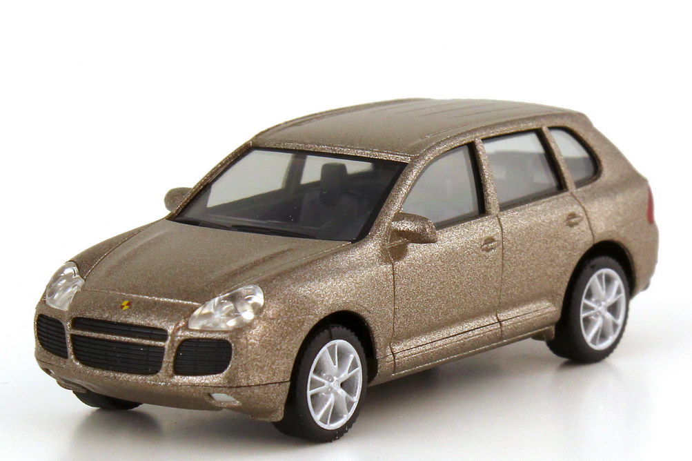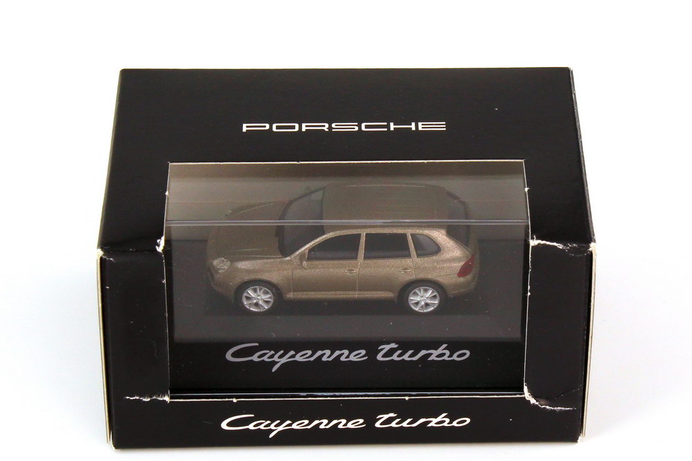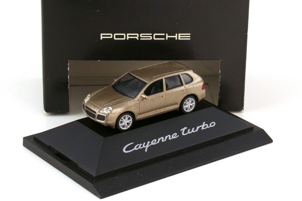 herpa-Modellauto in Minivitrine, M 1:87, Porsche Cayenne turbo (9PA) jaramabeige-met. (Porsche-Werbemodell)
