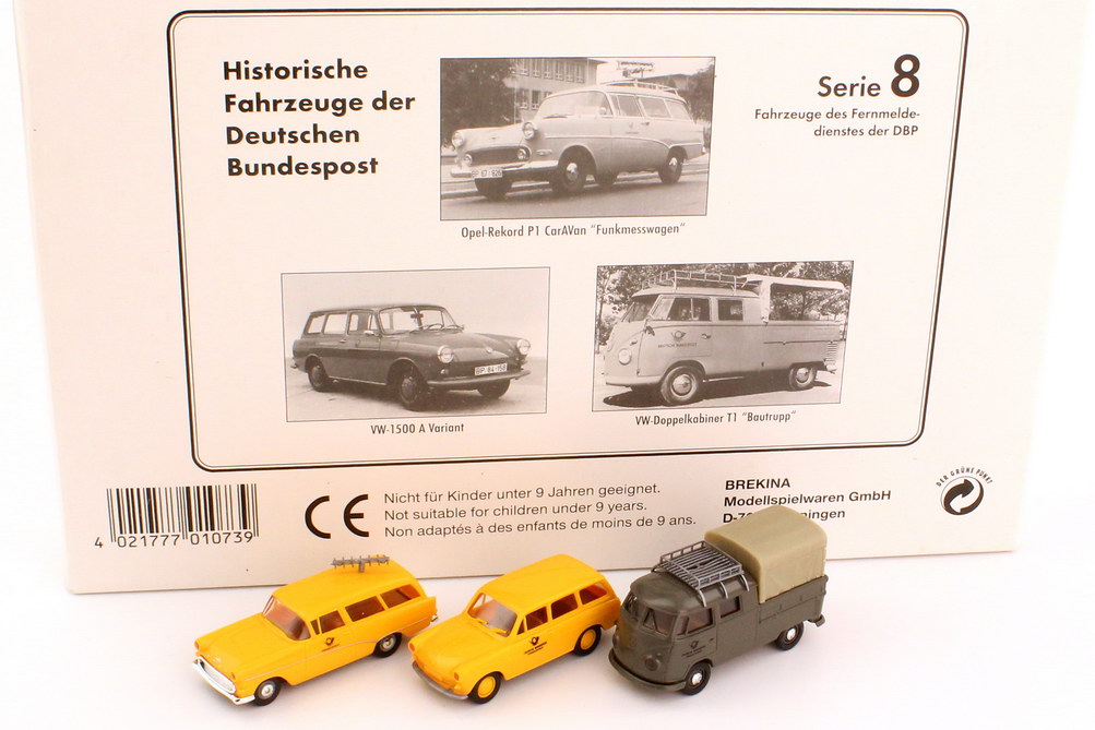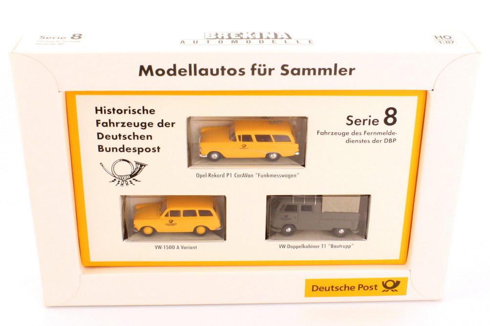 1:87 Post-Set Serie 8 "Fahrzeuge des Fernmeldedienstes der DBP" (Opel Rekord P1 CarAVan Funkmesswagen + VW 1500 A Variant + VW T1 Doka Bautrupp) Brekina