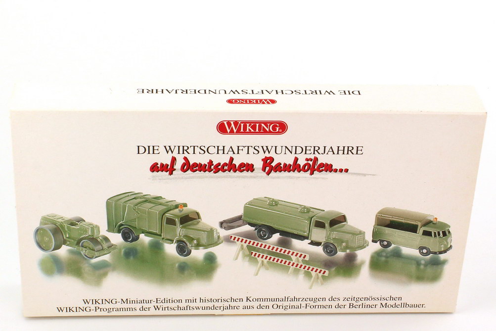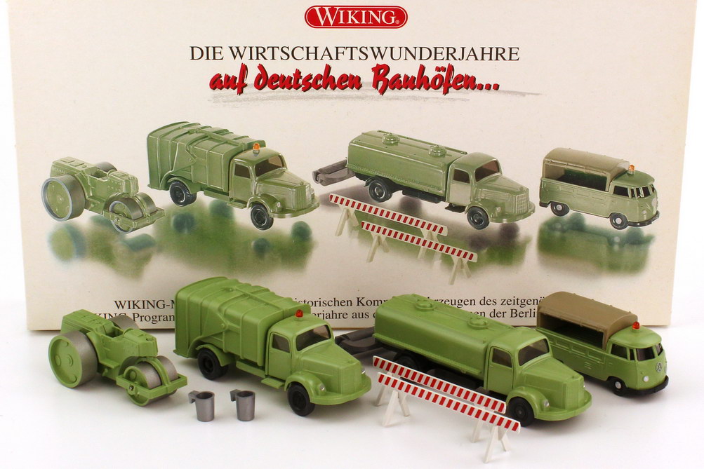 Wiking-Modellauto, M 1:87, Set-Packung "Die Wirtschaftswunderjahre - auf deutschen Bauhöfen..." (Bestehend aus: Zettelmeyer Straßenwalze, VW T1 Pritze/Plane, Mercedes Sprengwagen, Mercedes Müllwagen, 2 Absperrschranken und 2 Mülltonnen)