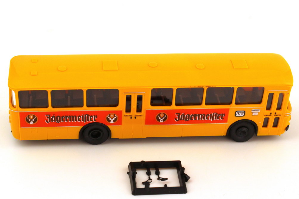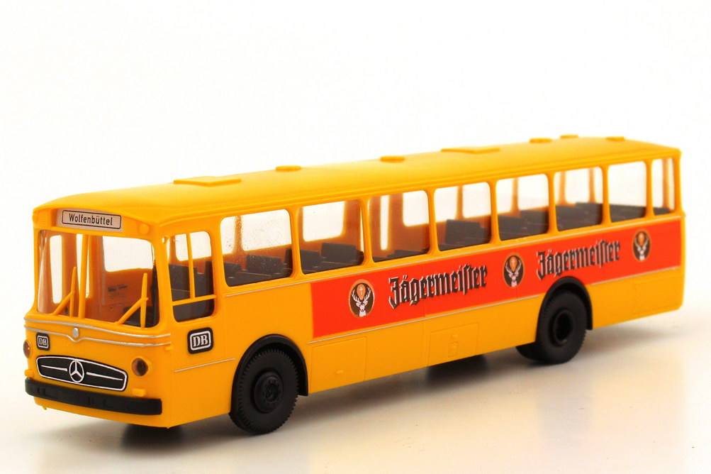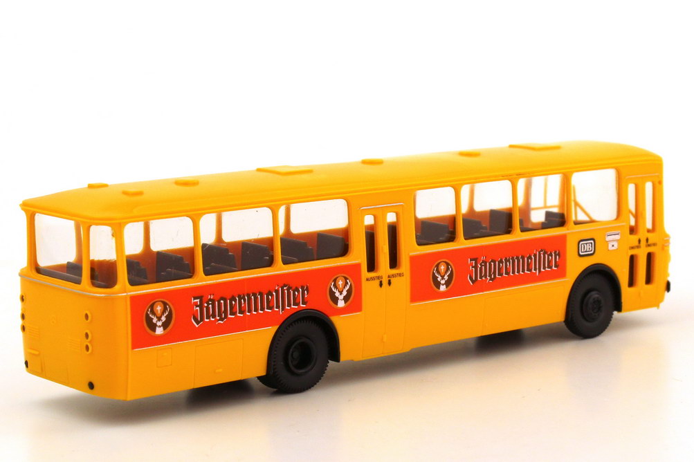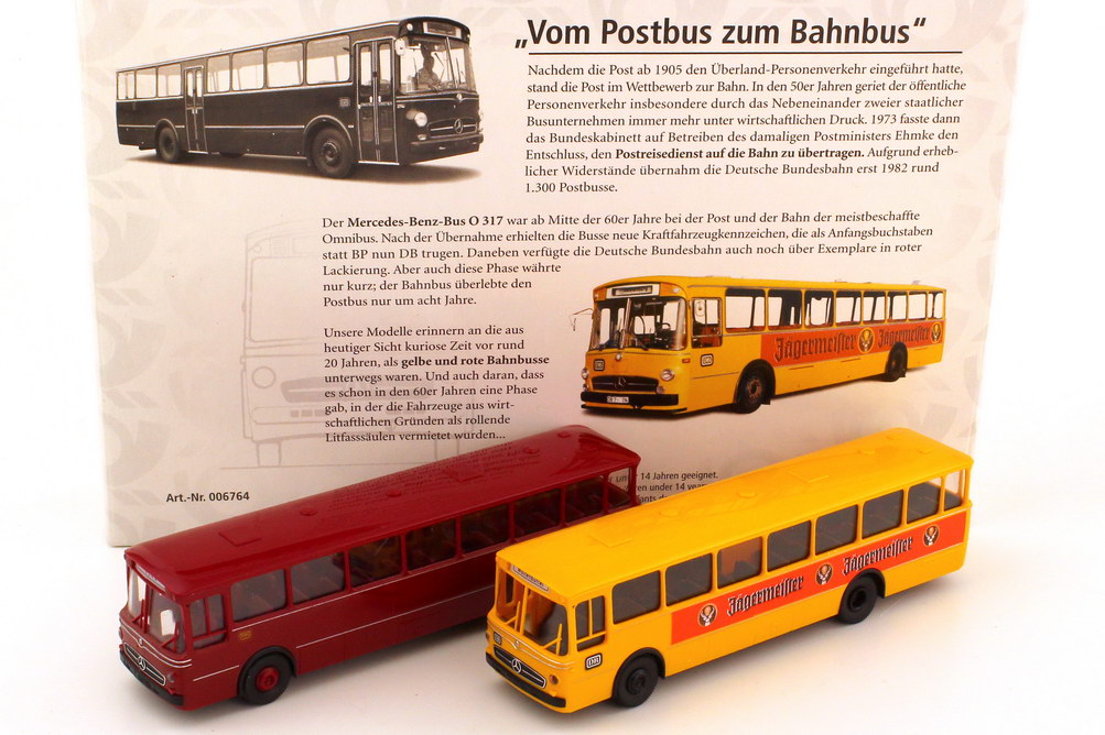 Brekina-Modellauto, M 1:87, Setpackung "Vom Postbus zum Bahnbus" (Mercedes-Benz O 317 K Bahnbus + Mercedes-Benz O 317 K Postbus mit Jägermeister-Werbung)