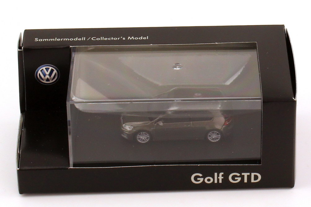 Rietze-Modellauto in Minivitrine, M 1:87, VW Golf VII GTD 2013 2türig limestone-grey-met. (Volkswagen-Werbemodell)
