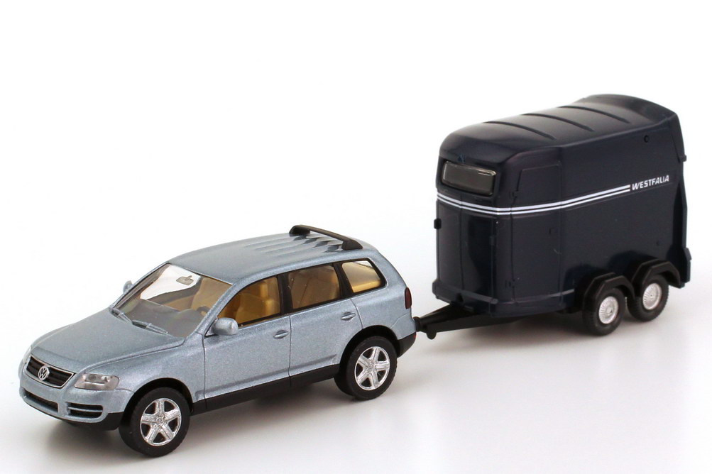 Wiking-Modellauto, M 1:87, VW Touareg silberblau-met. mit Westfalia Pferdetransportanhänger (Volkswagen-Werbemodell)